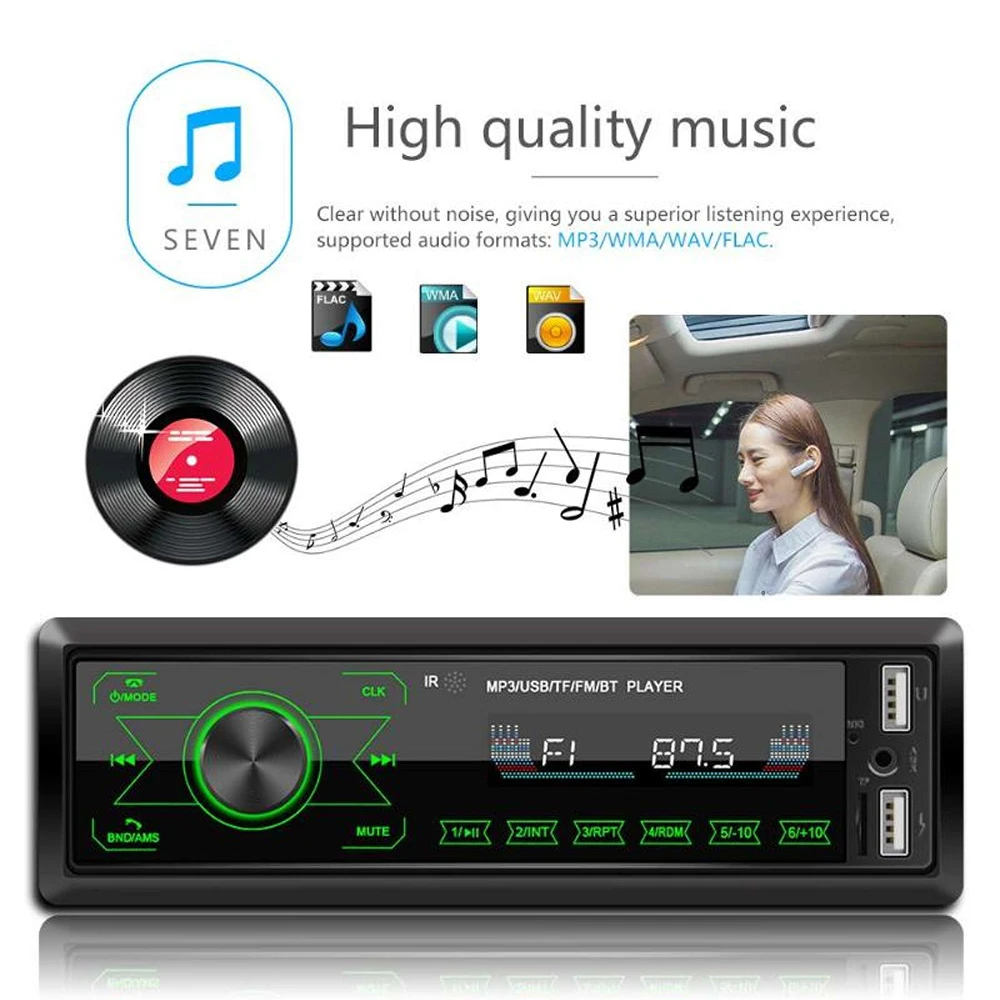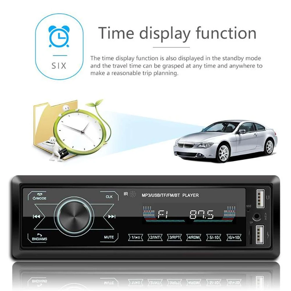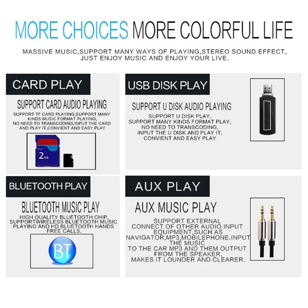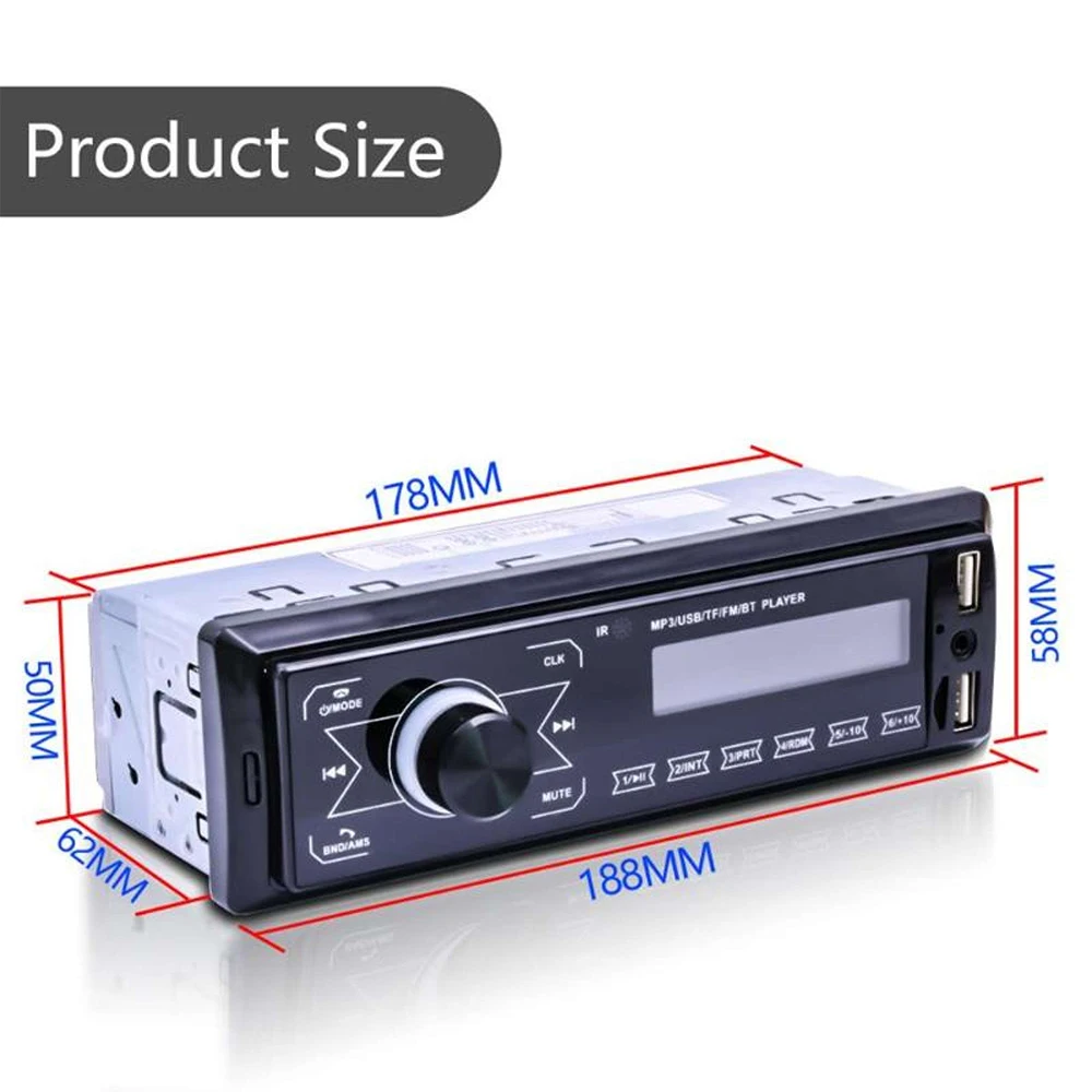 -С Bluetooth беспроводной передачей, Автомобильный MP3-плеер может обеспечить вам низкое энергопотребление и стабильное качество звука. Вы можете отвечать на звонки, слушать музыку или транслировать мобильный телефон с помощью навигации. -Вы можете использовать Автомобильный MP3-плеер, чтобы узнать последние условия дорожного движения, услышать финансовые отчеты, слушать прогноз погоды, или получить информацию в реальном времени или новости вокруг вас с его функцией fm-радио. Сопровождение многих радиостанций, вы не будете чувствовать себя одиноко, когда вы едете за рулем. -Изготовлен из высококачественного пластика и металла, Автомобильный MP3-плеер прочный и надежный для длительного использования. -Длина автомобиля MP3 плеер является 18,8 см, ширина 5,8 см, а высота составляет 6 см. -Подходит для модификации автомобильного центра управления.