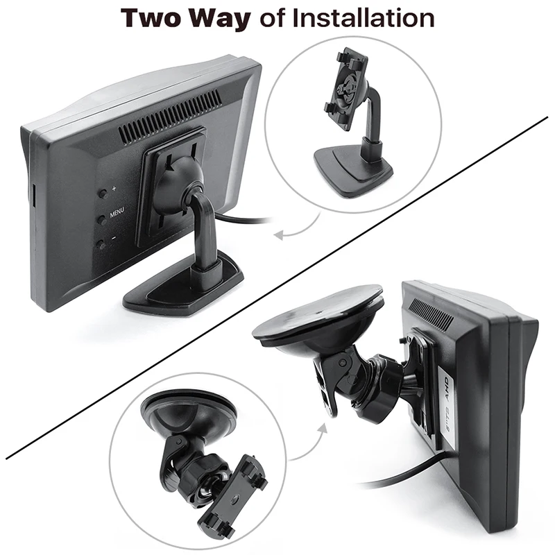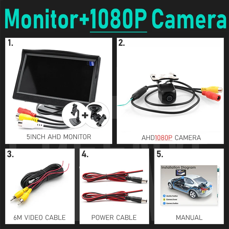 1 x аналоговая камера высокого разрешения 5 дюймов автомобильный монитор1 x камера заднего вида AHD1 х 6 м видео кабель2x1,5 м Мощность кабель1 x Крепление на присоске