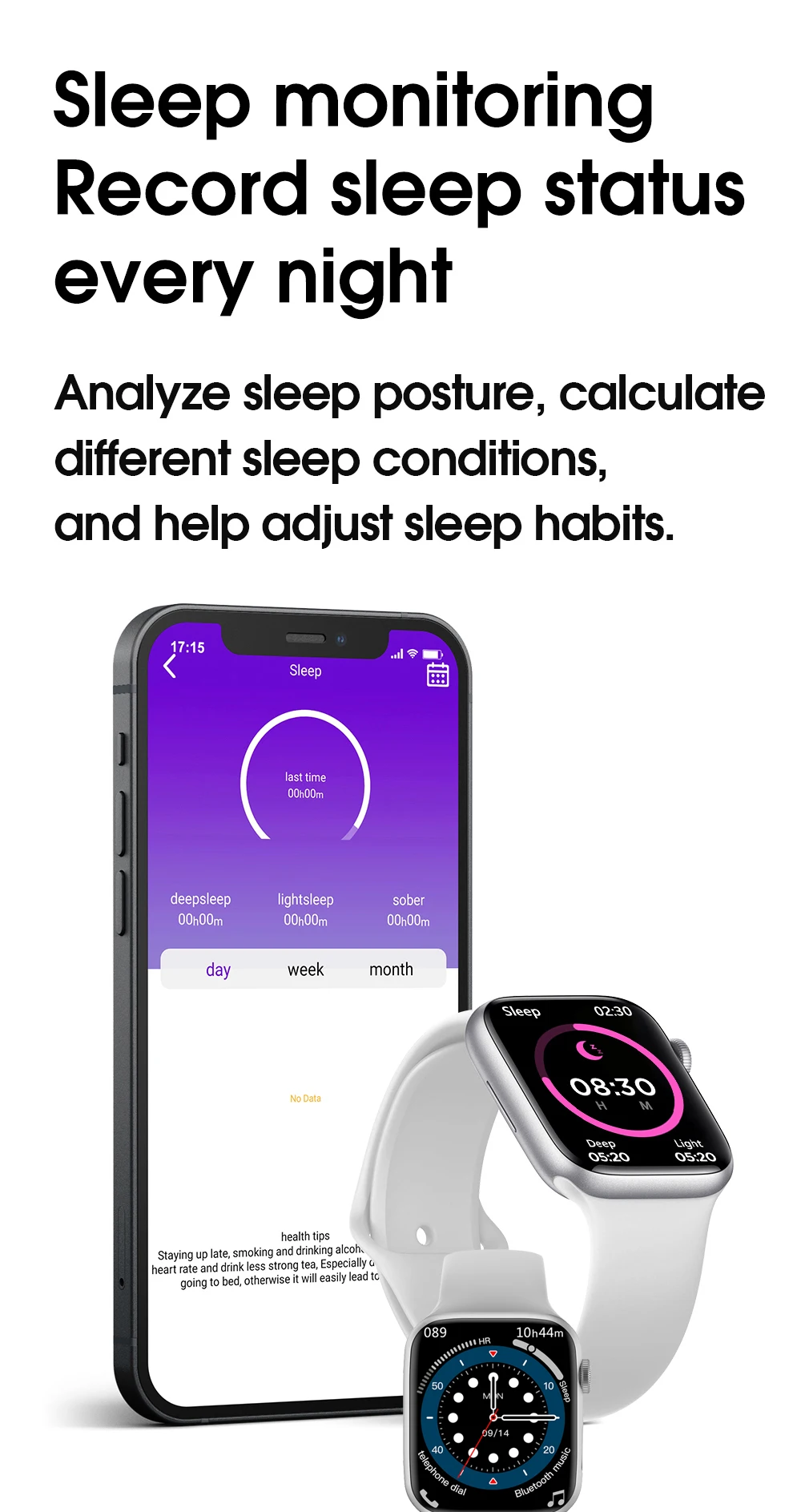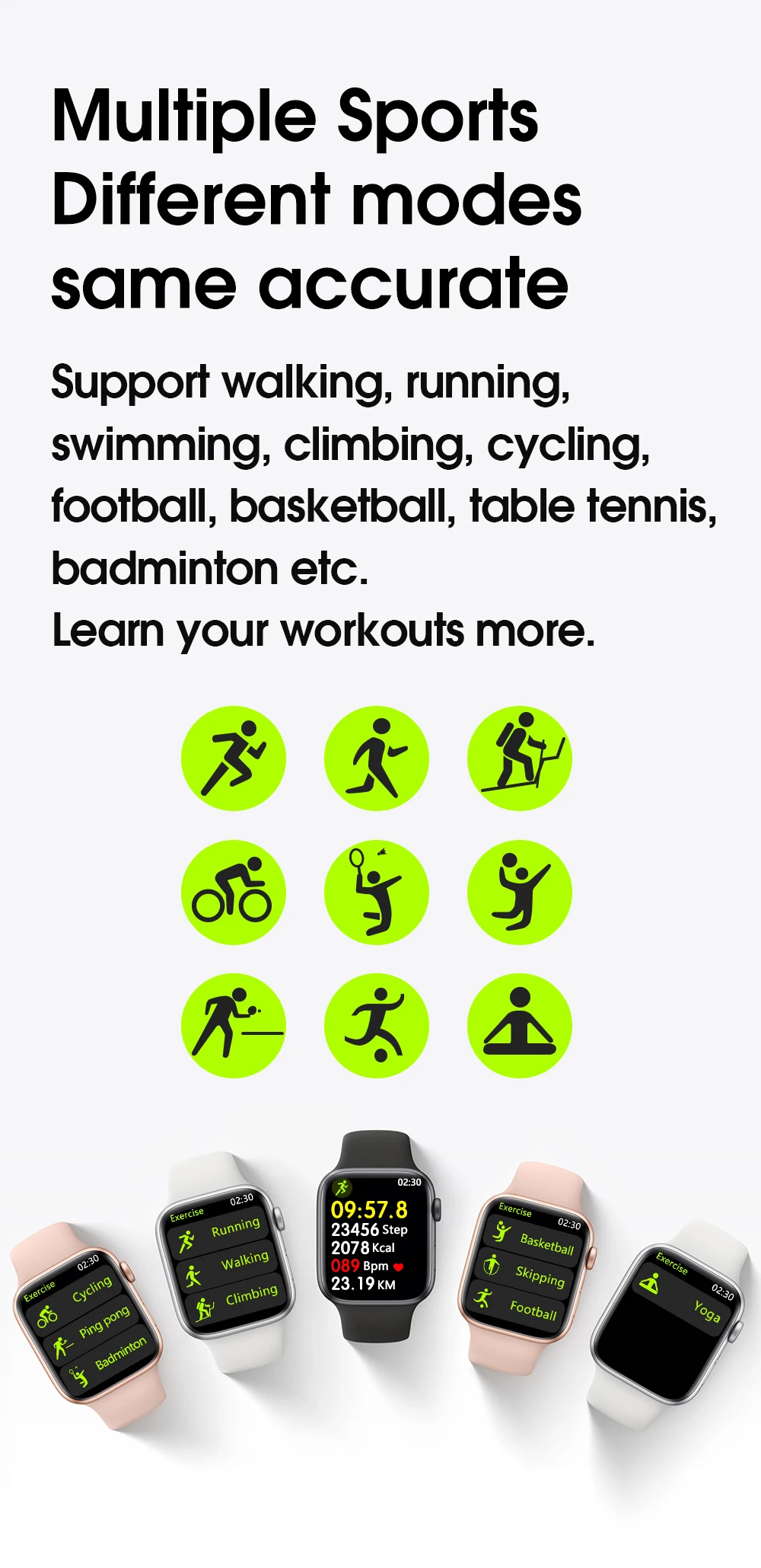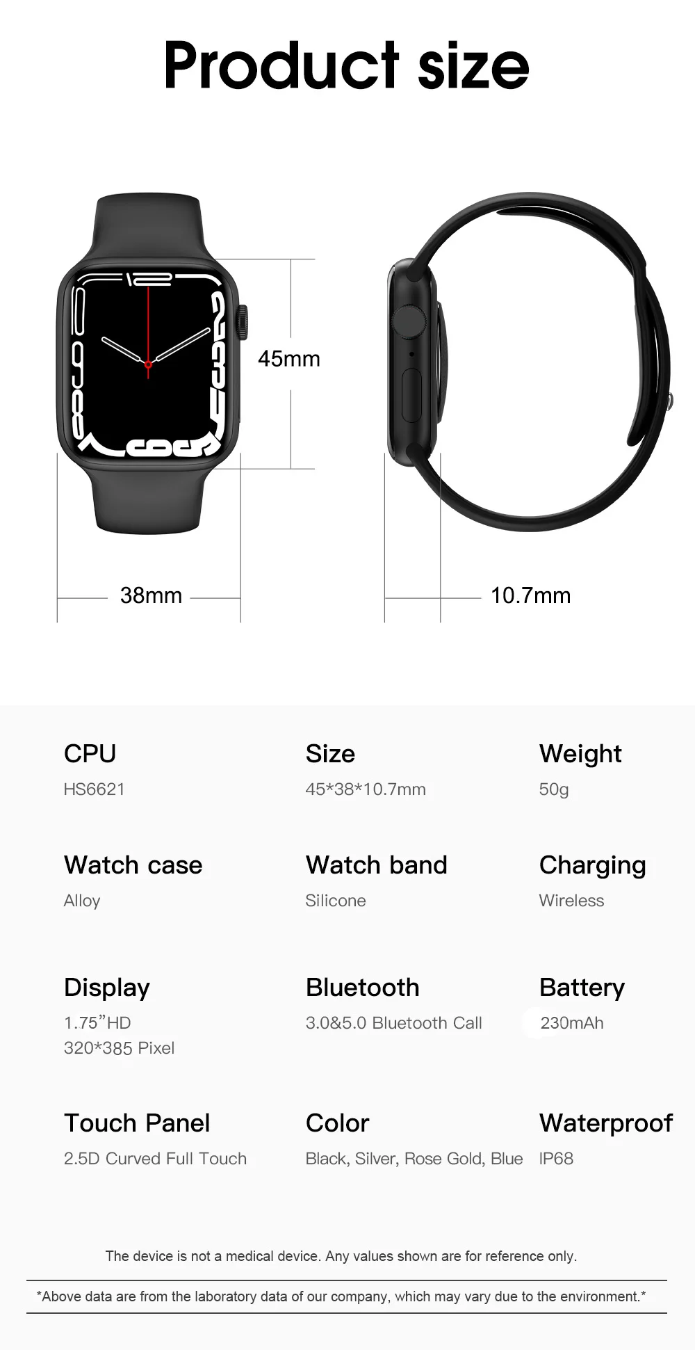 Пункты продажи: IP68 водонепроницаемый, 1,75 дюймовый дисплей, низкое потребление двойного режима Bluetooth, SiriОсновные характеристики: загрузка Watchface, Разделенный экран, блокировка доступа, вызов Bluetooth, частота сердечных сокращений, BP, ECG, запись периода для женщин.