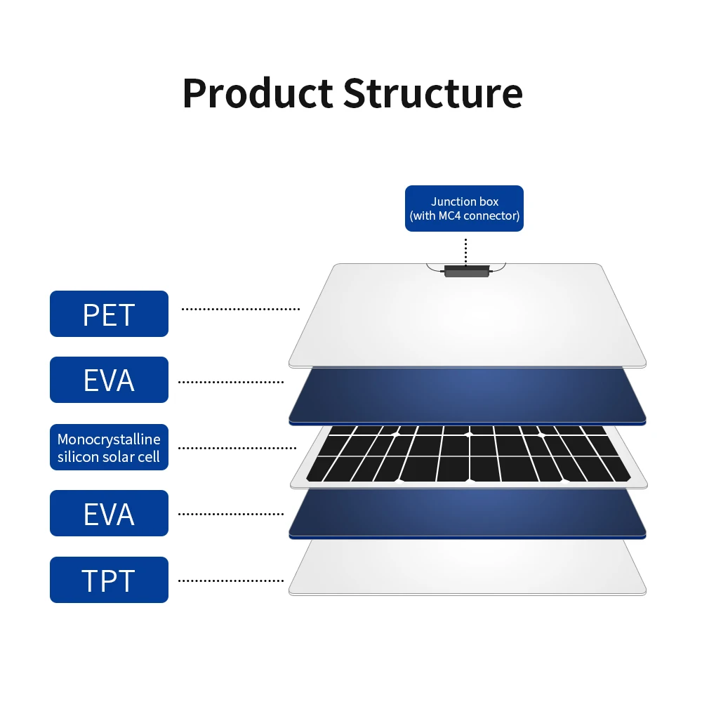Солнечная батарея: монокристаллический кремний, эффективность ячейки:> 22%Максимальная мощность: 100 ВтМаксимальное напряжение питания: 18 вМаксимальный ток: 5.55AНапряжение открытого замыкания: 22 вТок короткого замыкания: 5.95AРазмер: 1030x525x2.5мм, вес за штуку: 1,95 кгТип распределительной коробки: IP67, длина кабеля: 90 смСтандартные условия испытаний: AM1.5 100mw / cm2 25 ℃
