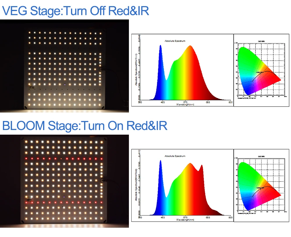 Полный спектр для вегетативной и цветущей стадии: 430 ~ 440нм, 450 ~ 475нм, 620 ~ 630нм, 650 ~ 670нм, белый, ИК (730нм)