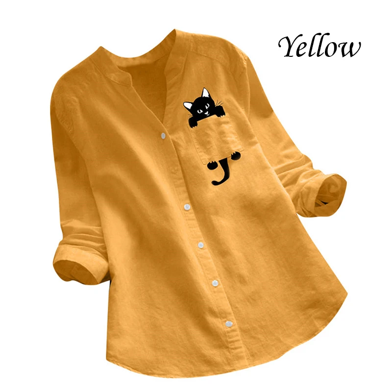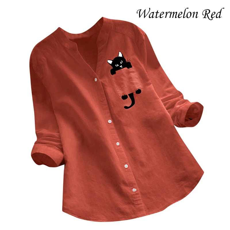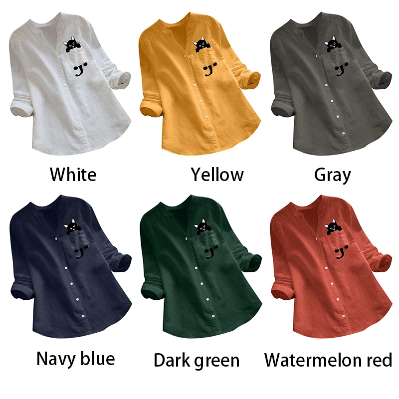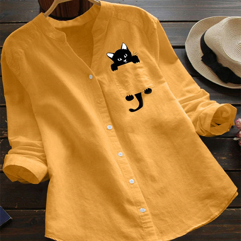 Блузка женская с принтом кошки, повседневный топ на пуговицах, с V-образным вырезом, хлопковая рубашка с длинным рукавом, свободная туника, весенняя одежда, Прямая поставка