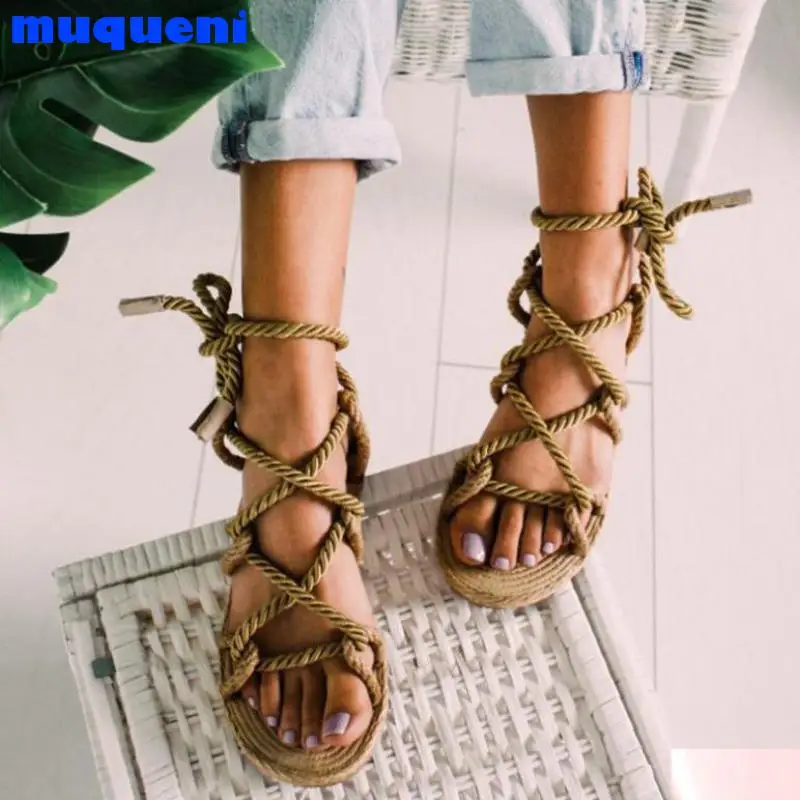 Сандалии женские на шнуровке, босоножки-гладиаторы с пеньковой веревкой, повседневная обувь в римском стиле, Размеры 35-43, 2021