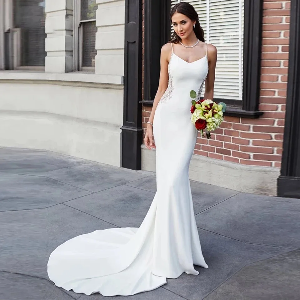 Платье Русалка на бретельках Свадебные платья 2021 с кружевной аппликацией, без рукавов развертки Поезд Элегантные атласные пикантное свадебное платье с открытой спиной