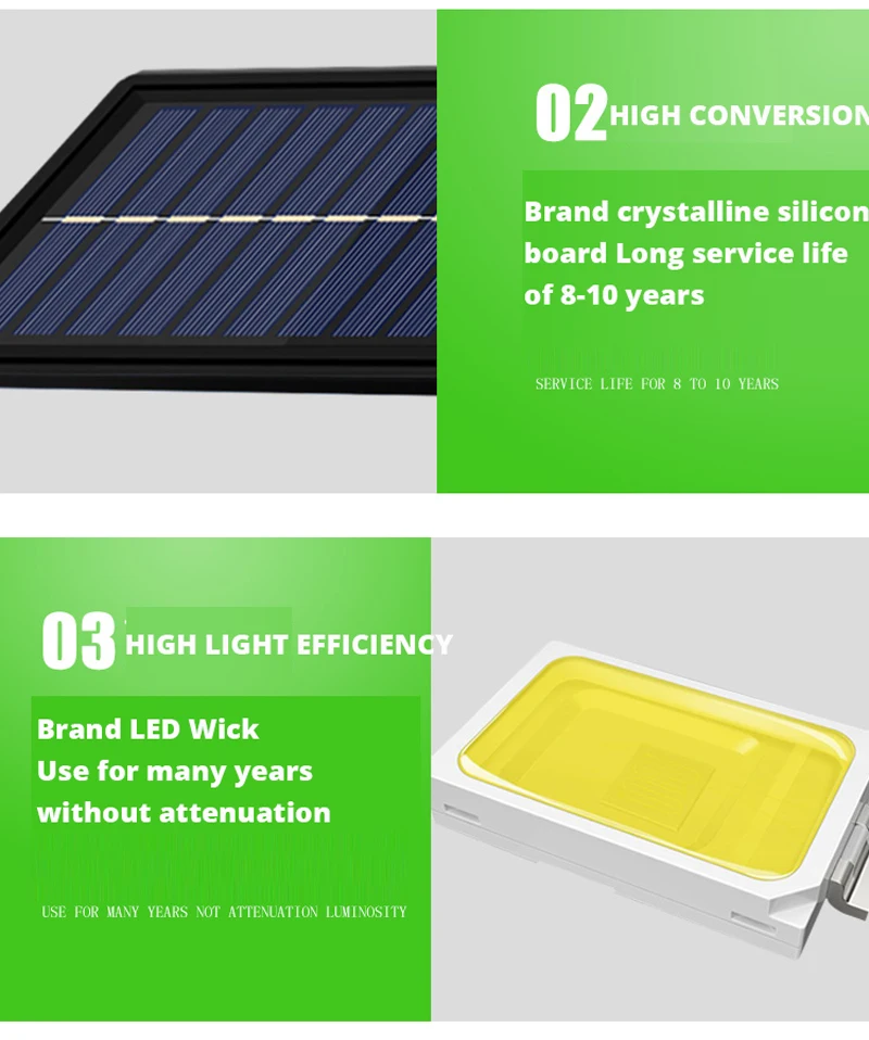 1. Солнечный свет является управление светом, автоматически выключаются, и при этом зарядка в дневное время, если вы хотите, чтобы он работает в дневное время, вам нужно использовать что-то, чтобы покрыть панели солнечных батарей 2. Пожалуйста, укажите эту опцию перед его под солнцем, чтобы зарядить его в течение нескольких часов в тех случаях, когда вы используете его в первый раз 3. Зарядка через месяц в тех случаях, когда устройство не используется в течение длительного времени 4. Эффективность солнечной панели зависит от погодных условий, под интенсивными прямыми солнечными лучами у него, Повышенная эффективность будет эффективность Солнечная панель будет ослабляться в пасмурный день, чем дольше солнце он имеет Рабочая займет больше времени