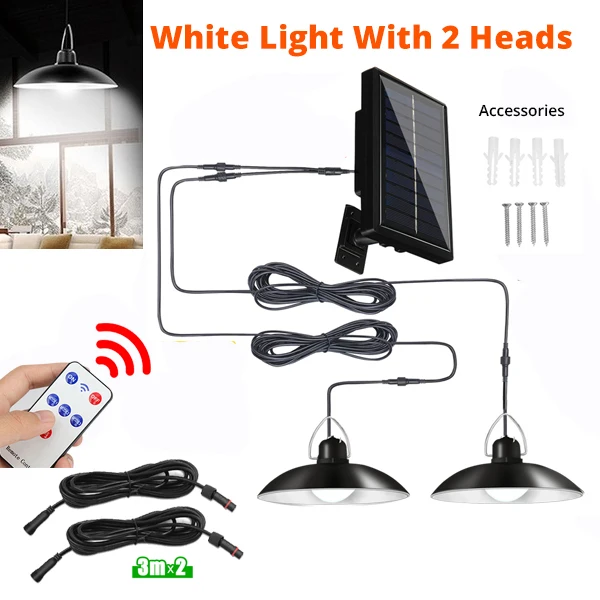 Тип: Солнечный свет одиночный/двойной головкой люстра Солнечная панель: 1,5 W 5,5 V Рабочий режим: обычно заказанный товар на Светодиод: 30pcs SMD 2835 Материал абажура: ПК Светодиодный Цветность света: белый Материал корпуса: поликарбонат + АБС-пластик Выходная мощность: 1,8 W Класс водонепроницаемости: IP44 Фиксированное положение и метод: кнопочный переключатель + пульт дистанционного управления + индукции на панели солнечных батарей