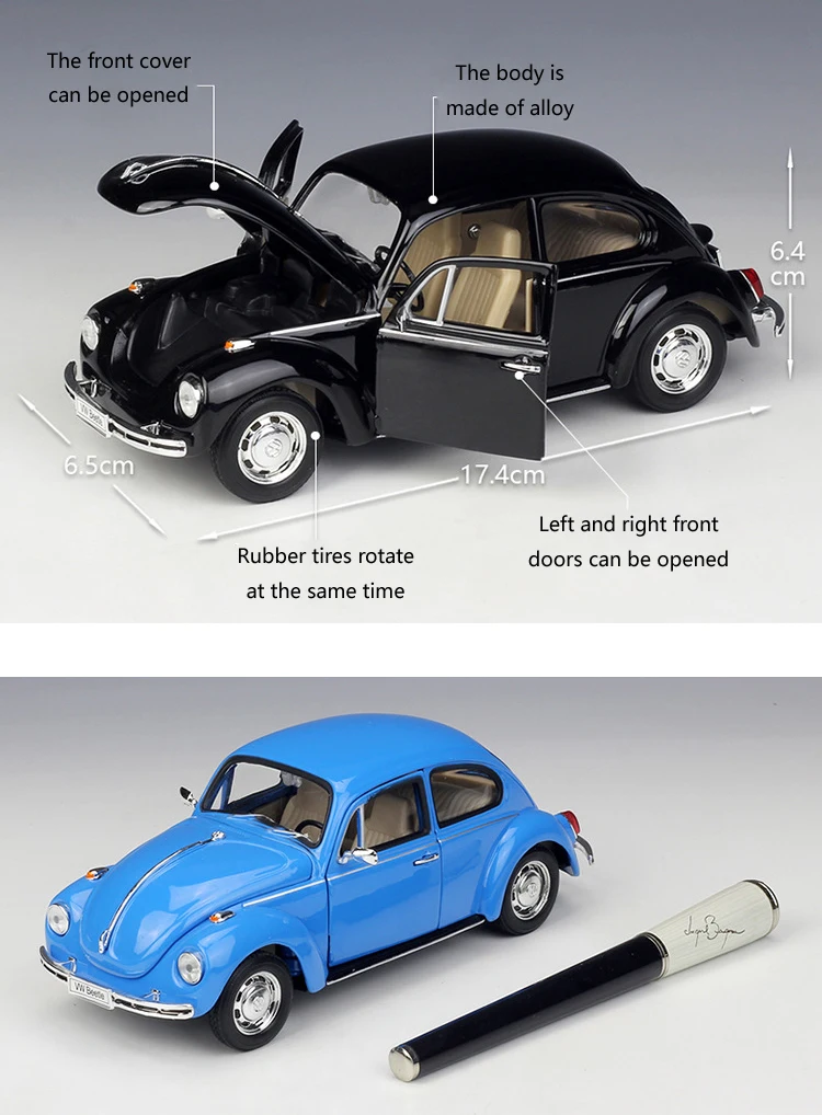 Welly литье под давлением 1:24 автомобиля моделирование металла классические автомобили Volkswagen Beetle модель автомобиля VW сплав игрушечный автомобиль для детей подарочная коллекцияМатериал: металл и пластикМасштаб: 1:24Размеры: 17.4cmX6.5cmX6.4cmПосылка: 1 шт. литая под давлением модель автомобиля игрушка вПенная коробкаПримечание:Дорогой друг, пожалуйста, не открывайте дверь с зеркалом заднего вида, чтобы зеркало заднего вида не отвалилось! Спасибо за сотрудничество.