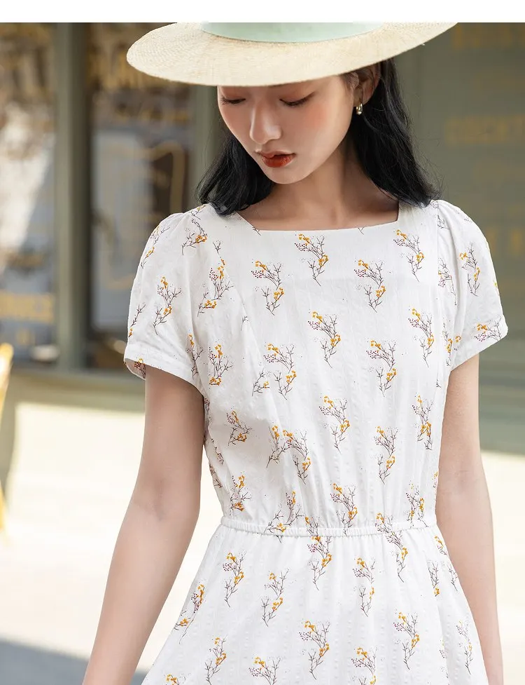 Женское цельнокроеное платье с квадратным вырезом, эластичное белое платье с цветочным принтом на пуговицах на спине