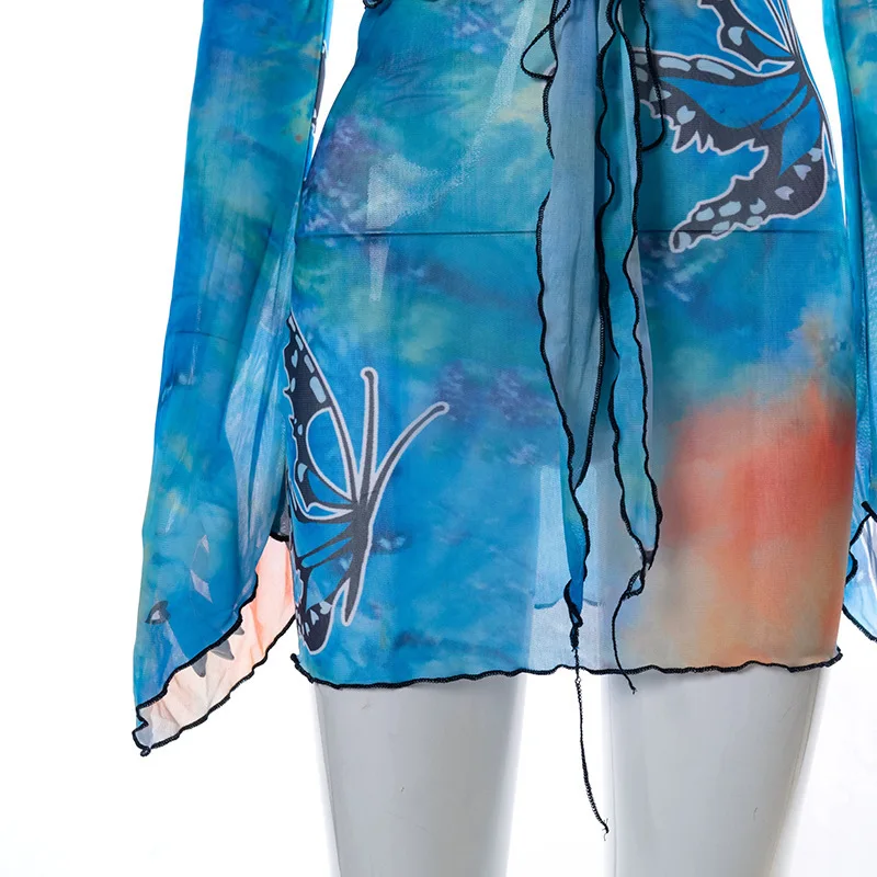 Сексуальные облегающие платья Y2K с вырезами, Сетчатое женское мини-платье с принтом бабочки, Прозрачная Клубная одежда с длинным рукавом, уличная одежда