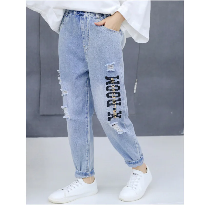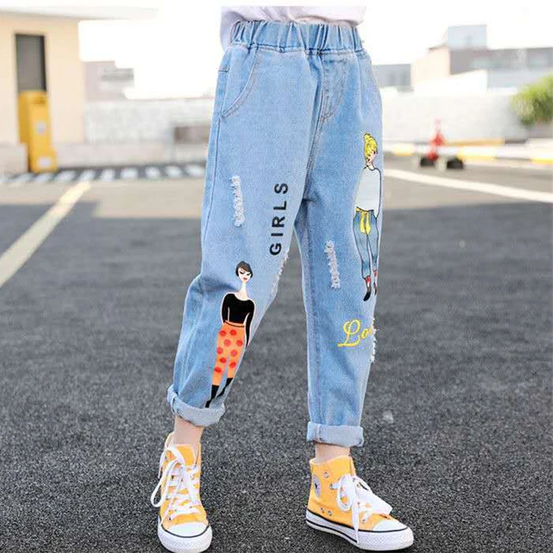 Джинсы для девочек; Сезон весна-осень; Джинсы с дырками для маленьких девочек; Модные хлопковые детские брюки; Джинсовые От 3 до 10 лет с мультяшным принтом