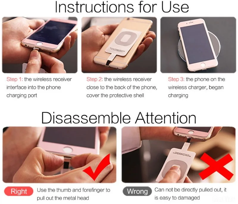 Если ваш мобильный телефон не имеет беспроводного зарядного передатчика Qi, пожалуйста, приобретите беспроводной зарядный передатчик Qi, в противном случае вы не можете использовать приемник беспроводной зарядки Qi.