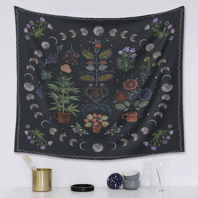 Настенный подвесной гобелен с Лунной фазой, ботанический Небесный цветочный настенный гобелен, настенная ткань в стиле хиппи с цветами, декор для спальни, ковер с звёздным небом