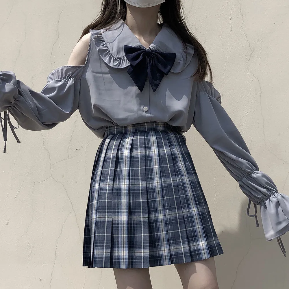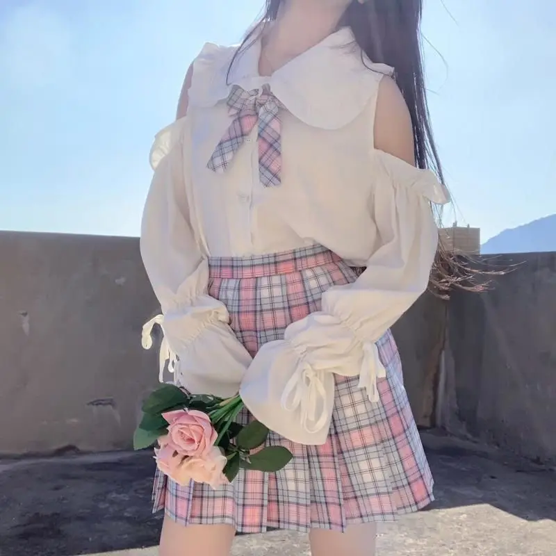 Женские рубашки с открытыми плечами, воротник Питер Пэн, милые топы В Стиле Лолита, милые однотонные женские рубашки для отдыха с длинными рукавами-фонариками и бантом на шнуровке