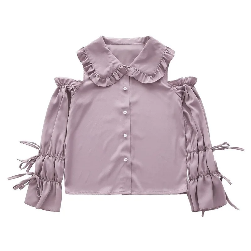 Женские рубашки с открытыми плечами и воротником Питер Пэн, милые топы в стиле "Лолита", милая однотонная женская рубашка для отдыха с длинными рукавами-фонариками и бантом на шнуровке