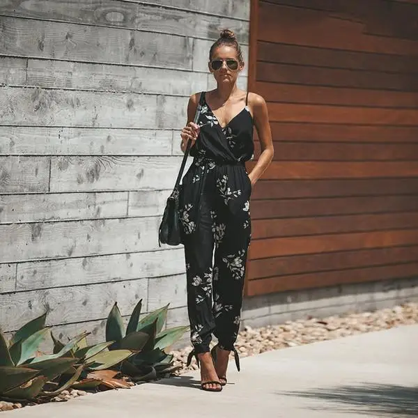 Комбинезон женский на бретелях-спагетти, повседневный свободный ромпер с цветочным принтом и V-образным вырезом, с боковыми разрезами и широкими штанинами в стиле бохо, лето 2021