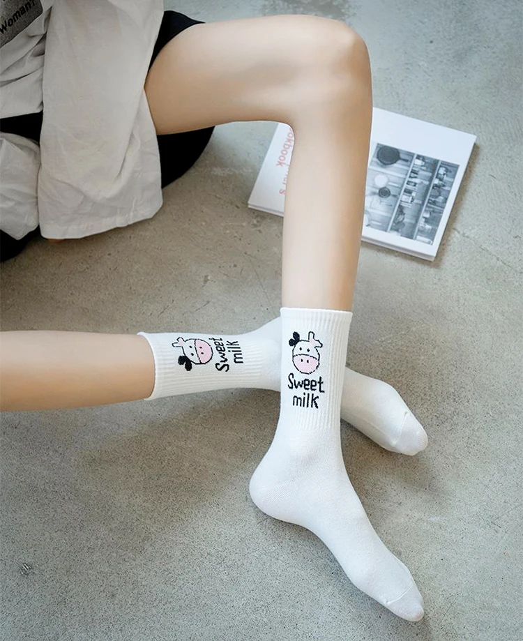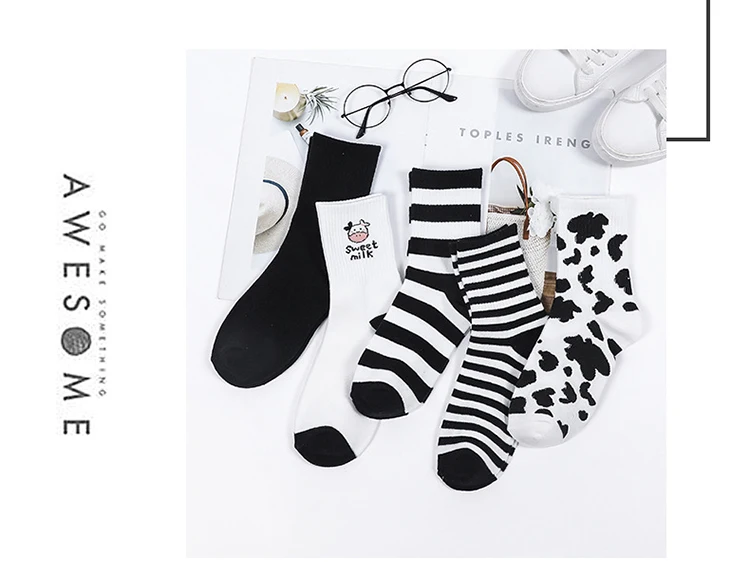 Носки в полоску с забавным принтом коровы, белые носки в стиле Харадзюку, женские носки с милыми животными, милые носки в стиле Харадзюку