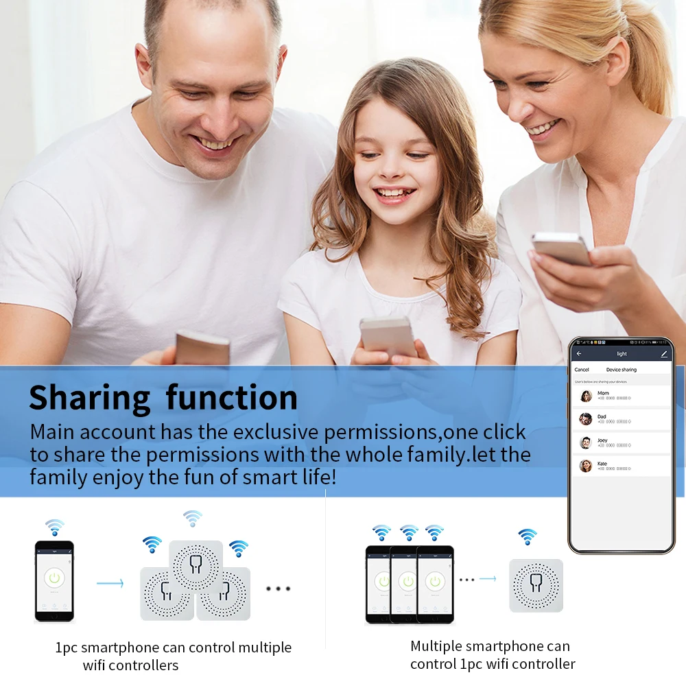 Одно нажатие, чтобы поделиться смарт-переключателем с вашим членом семьи с помощью приложения для устранения дополнительных процессов настройки. Главная учетная запись имеет эксклюзивные разрешения, один клик, чтобы поделиться eht разрешениями со всей семьей. Позвольте семье насладиться веселой умной жизнью!
