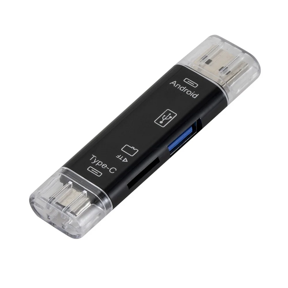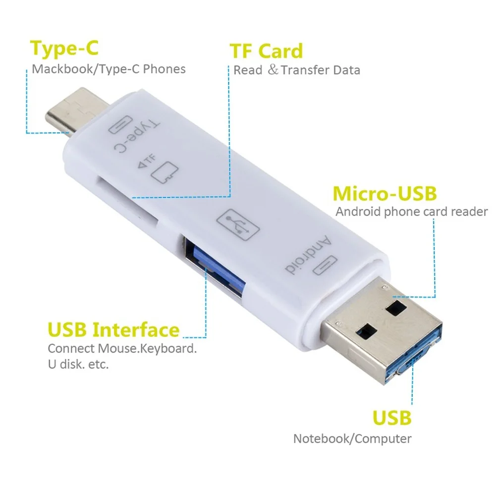Описание: 1. Название продукта: Тип-c 5-в-1 OTG кард-ридер 2. Цвет: черный, белый 3. Материал: АБС экологически чистый материал s 4. Функция продукта: USB2.0 male + MICRO male + Type-C male, Быстродействующее считывание карт памяти TF, внешняя клавиатура с интерфейсами USB male, мыши, флеш-накопители USB, usb-экраны, геймпады и другие usb-устройства. 5. Вспомогательное оборудование: мобильные телефоны, Macbook (USB Type-C), ноутбуки Google, обычные компьютеры (Windows ). 6. Совместимость с несколькими системами: Поддержка Micro / Usb / Type-c / TF