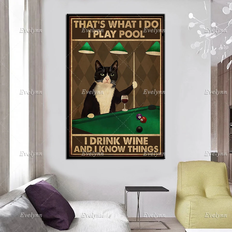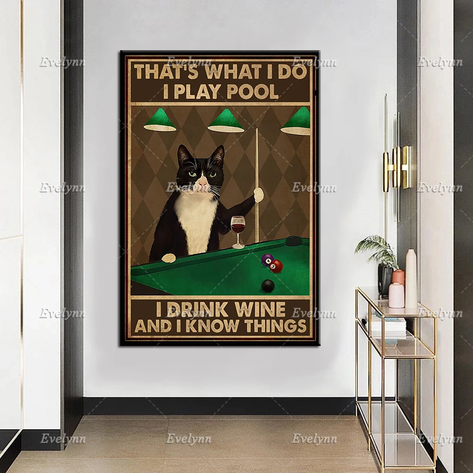 Бильярд, снукер, кошка, ловеры, это то, что я играю в бассейн, я пью вино и я знаю вещи, плакат, настенные художественные принты, домашний декор, холст