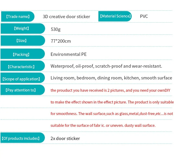 Описание: Название изделия: наклейка на дверь, фотообои на дверь, плакат на дверь, обои на дверь, также можно сказать наклейки на дверь, обои на дверь, обои на дверь особенность: самоклеющиеся, съемные, пилинг и палочка, экологически чистые, Высококачественные наклейки Материал: PVCTips: если вы получаете наклейку имеет некоторый запах, Это нормально, потому что он может отправить прямо сейчас после того, как мы закончили производство. Запах исчезнет через несколько часов. Все материалы безопасны и экологичны.