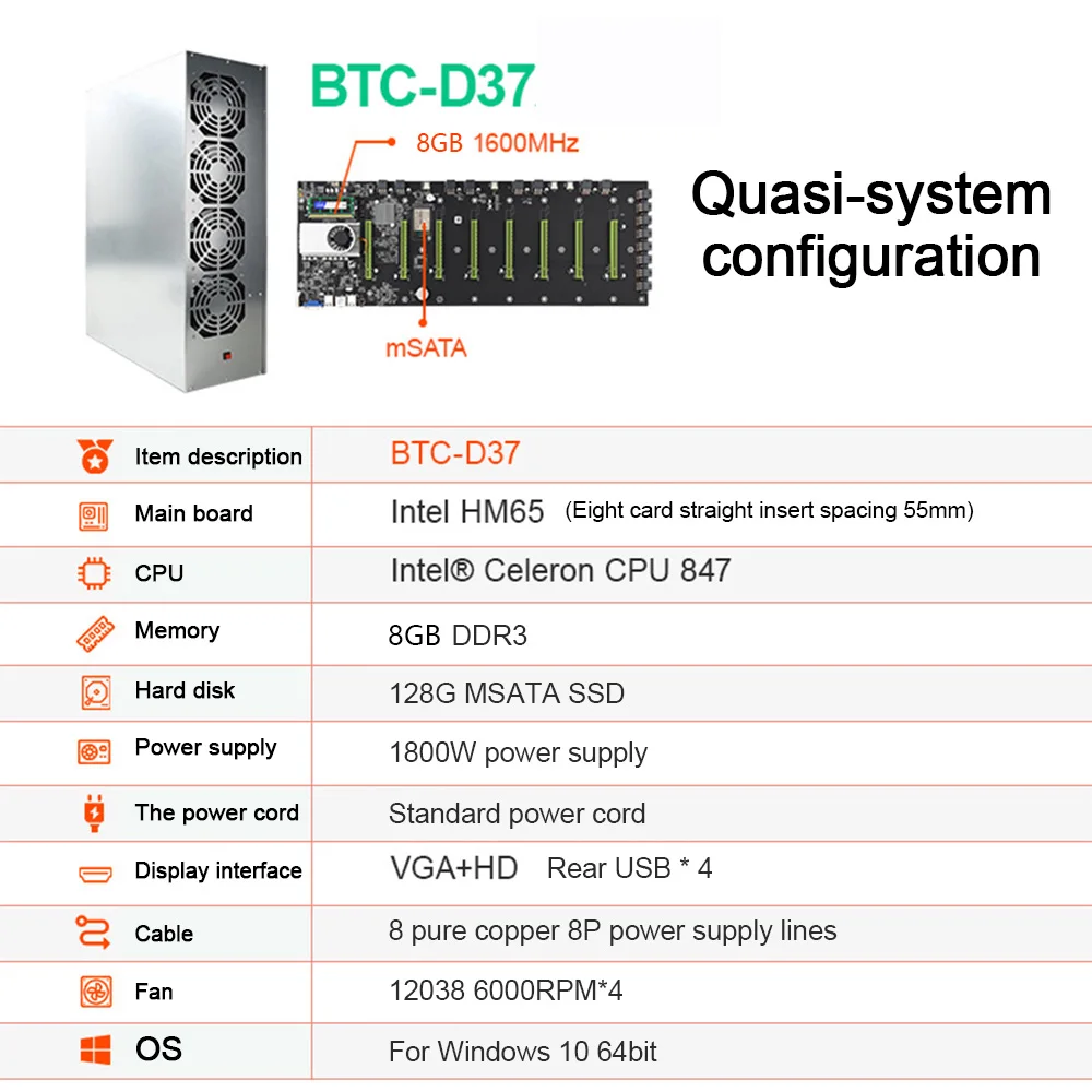 Описание:8xPCI-E 16X отделения для карт дисплея, 55 мм интервал.Высокая производительность вычислений, на 10% выше, чем Материнские платы того же уровня.Стабилизирующий конденсатор напряжения может обеспечить стабильное напряжение для вашего оборудования электропитания.Оснащен слотом памяти sodimm DDR3, 16x6PIN PCI-E X16 разъемом питания, что значительно повышает производительность материнской платы.Он может обеспечить тихую производительность, низкое энергопотребление, меньшее количество тепла, энергосбережение и безопасное использование.Характеристики:Посылка A (стандартное издание):Наименование товара: BTC-D37Память: разъем DDR3 Sodimm, поддержка 1066/1333/1600 МГцХранение: SATA3.0 + SATA2.0 + SATA2.0USB: 4xUSB2.0Сетевой порт: гигабитный сетевой порт RJ45Расширяемый Порты и разъёмы: 8xPCIE 16X,16x6PIN PCI-E X16 Питание гнездо, совместимому с HDMI + VGAРазмер материнской платы: 554x195ммВентиляторы: 4 вентилятора 12038 6000 об/минРазмер шасси: 630x400x180ммНет источника питанияНет 4 ГБ ddr3Нет 128G SSDБез шнура питанияНет линии питания 8pПосылка B (версия Barebone):Наименование товара: BTC-D37Память: разъем DDR3 Sodimm, поддержка 1066/1333/1600 МГцХранение: SATA3.0 + SATA2.0 + SATA2.0USB: 4xUSB2.0Сетевой порт: гигабитный сетевой порт RJ45Расширяемый Порты и разъёмы: 8xPCIE 16X,16x6PIN PCI-E X16 Питание гнездо, совместимому с HDMI + VGAРазмер материнской платы: 554x195ммВентиляторы: 4 вентилятора 12038 6000 об/минРазмер шасси: 630x400x180ммС источником питания 1800 ВтЕсть 4 ГБ ddr3Есть SSD 128GС шнуром питанияЕсть 8 8p линий электропитания