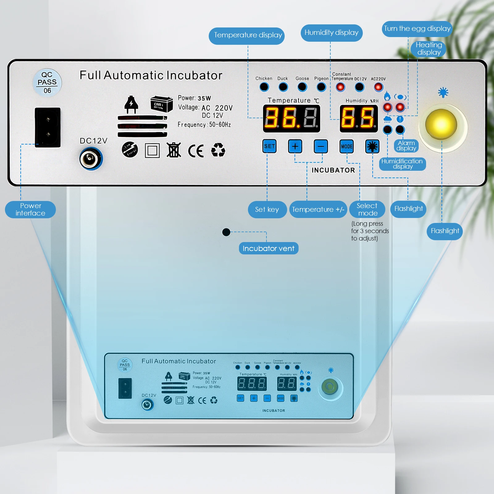 Простая эксплуатация благодаря автоматическим функциям; Идеально подходит для хобби и образовательных мероприятий даже вне фермы; Подходит для куриных яиц, утиных яиц, гусиных яиц и голубиные яйца
