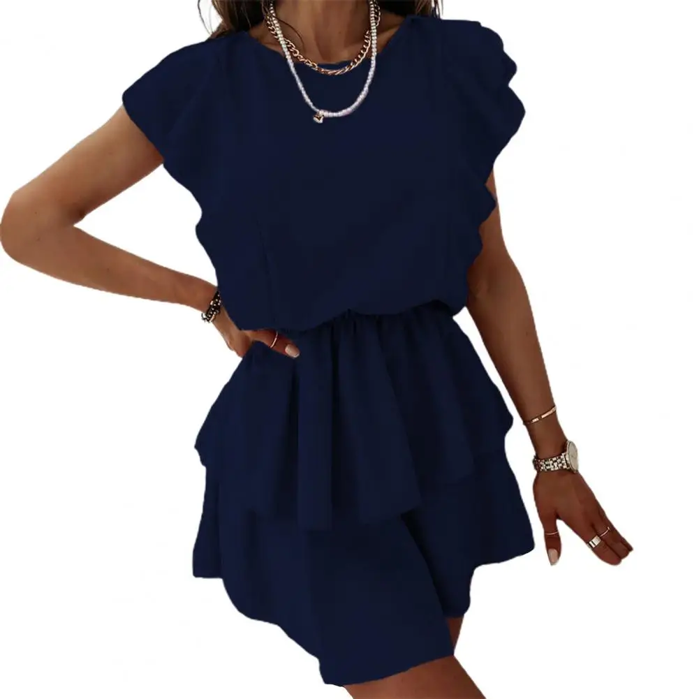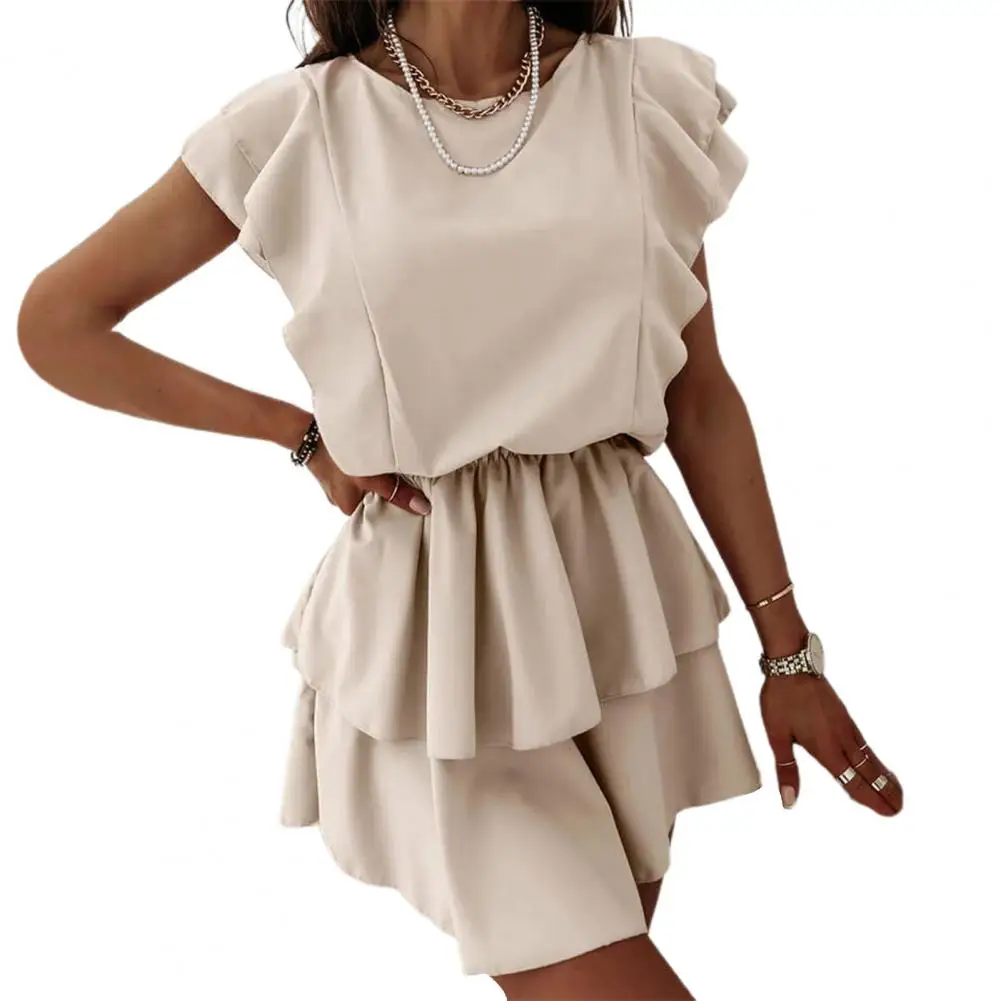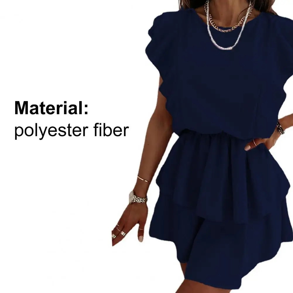 Женское мини-платье из полиэстера, с круглым вырезом, без рукавов, с оборками, однотонное, свободное, 2021