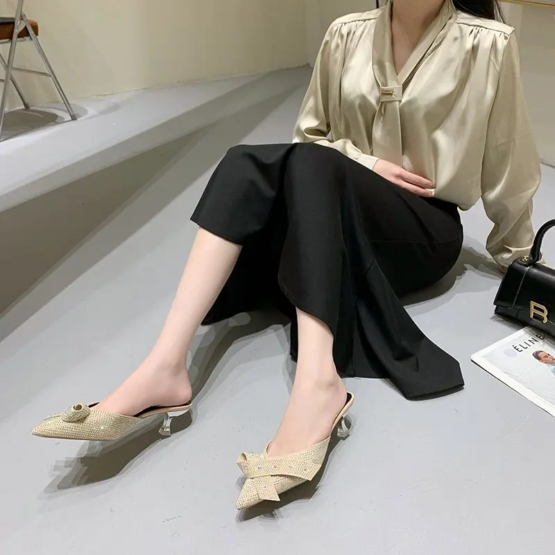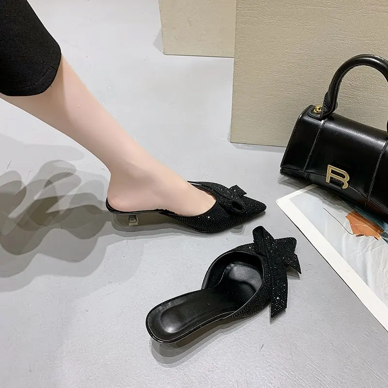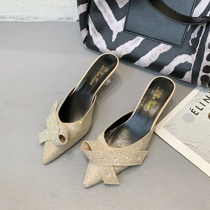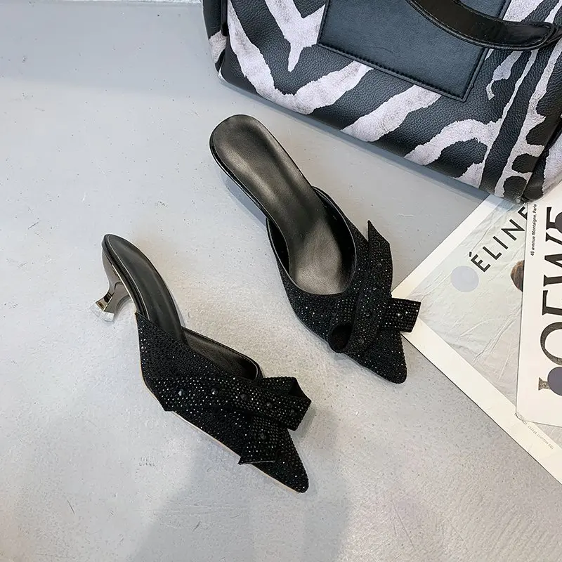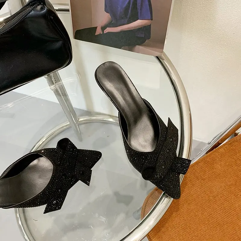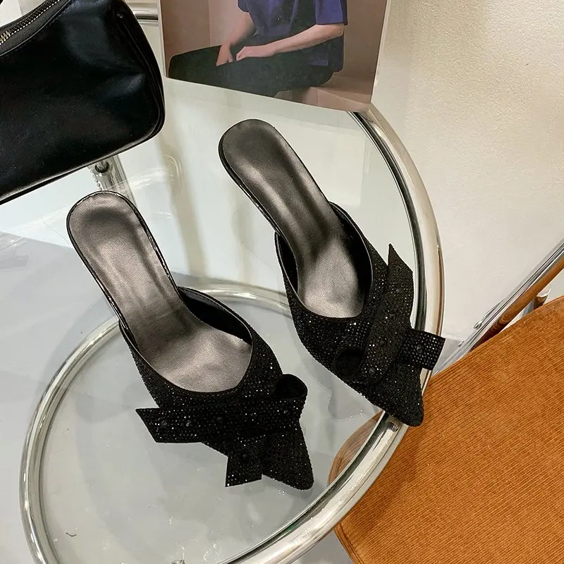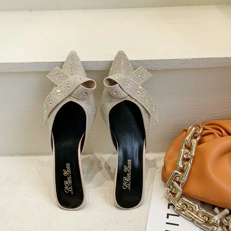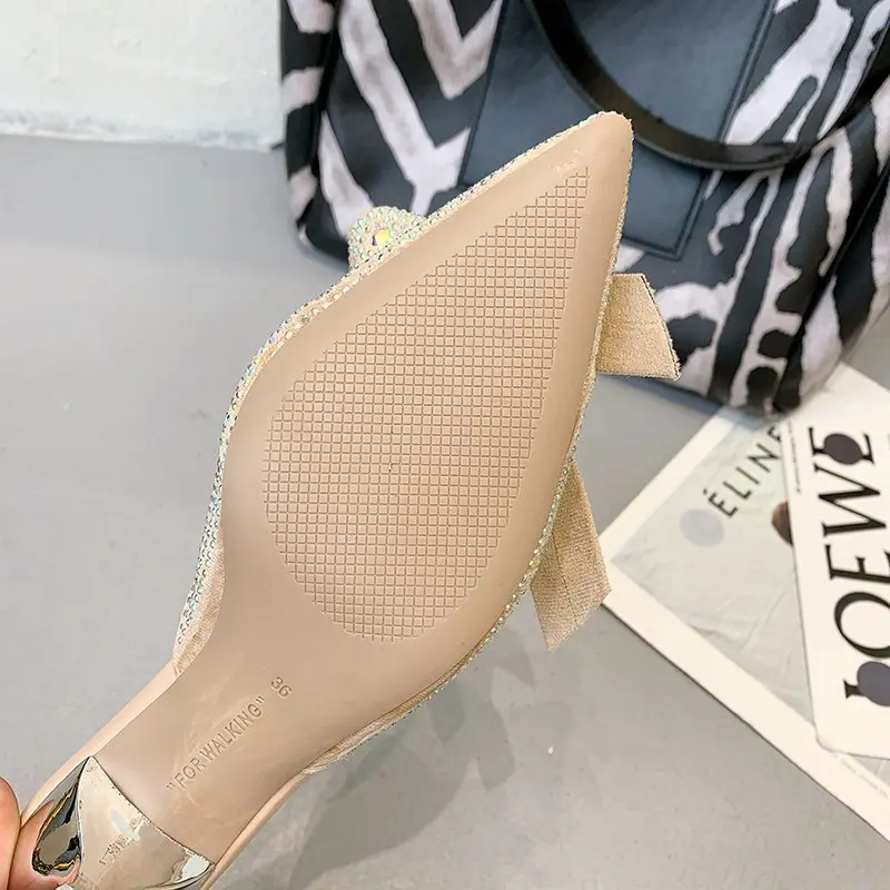 Полуботинки с острым носком шлёпанцы для женщин женская летняя одежда 2021 Новая мода стразы бант обувь без застежек, на высоких каблуках; Женская обувь BC558