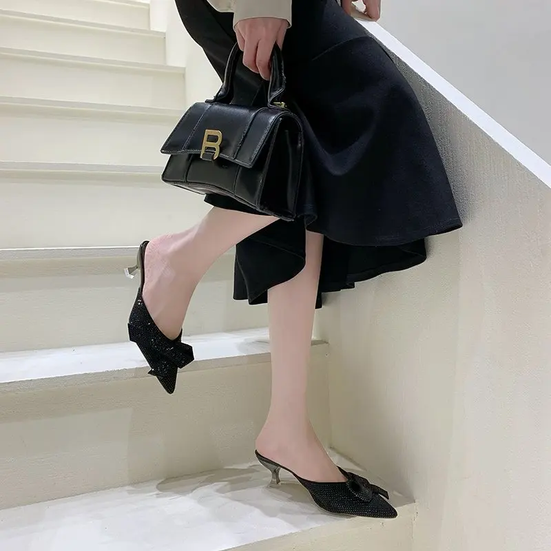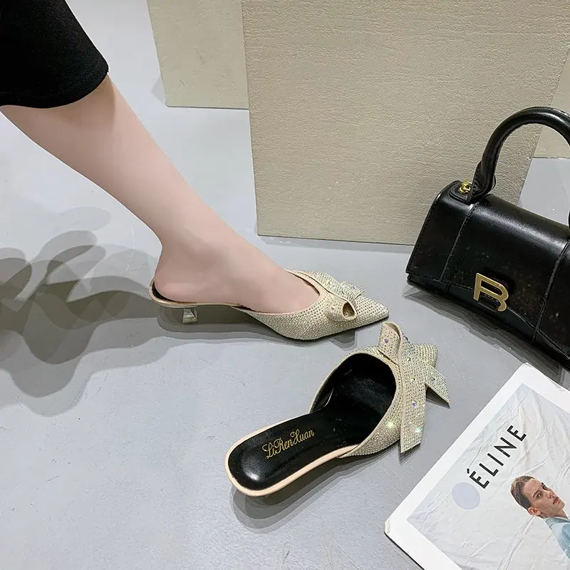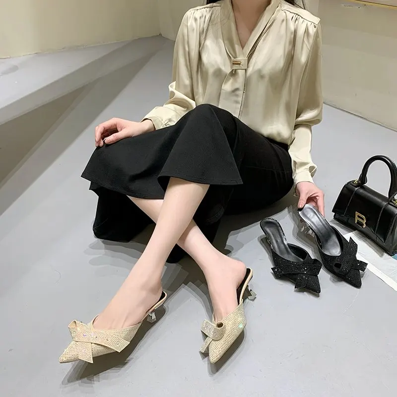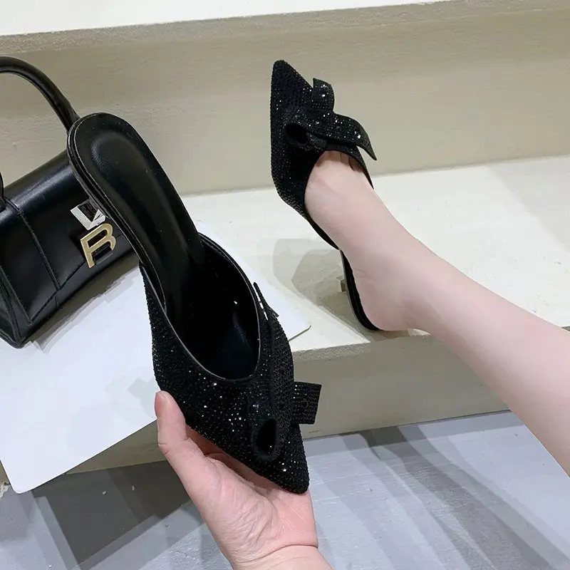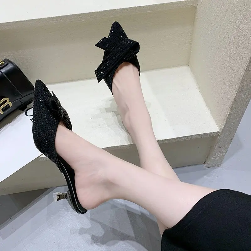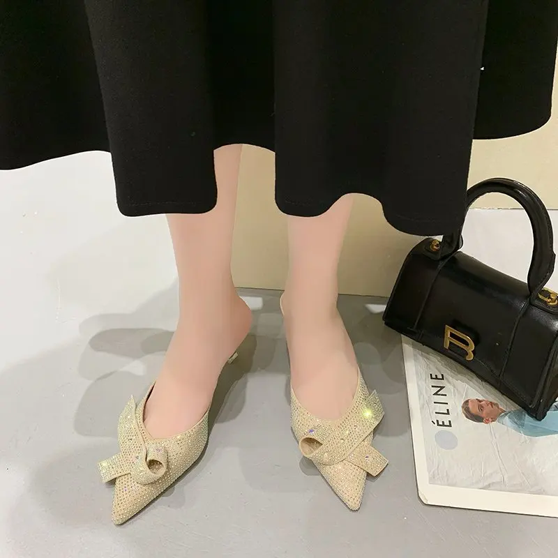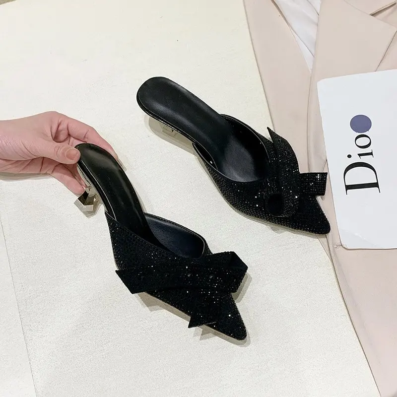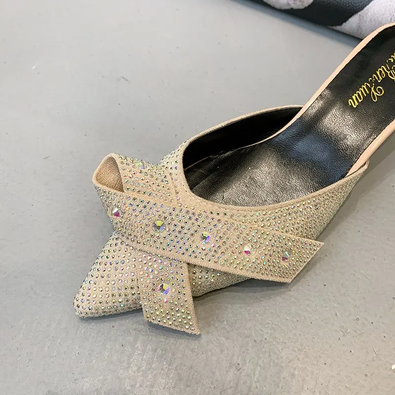 Полуботинки с острым носком шлёпанцы для женщин женская летняя одежда 2021 Новая мода стразы бант обувь без застежек, на высоких каблуках; Женская обувь BC558