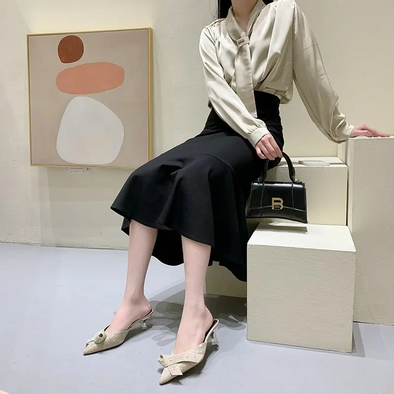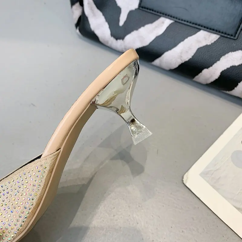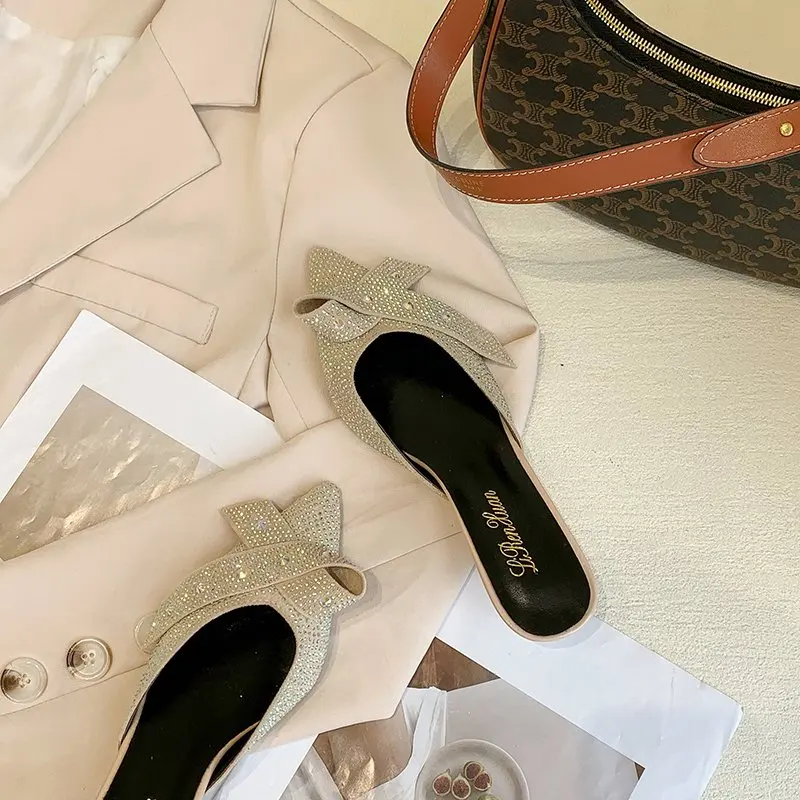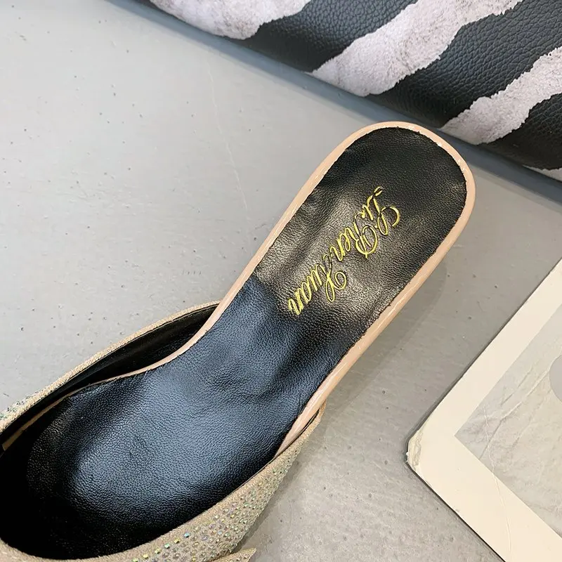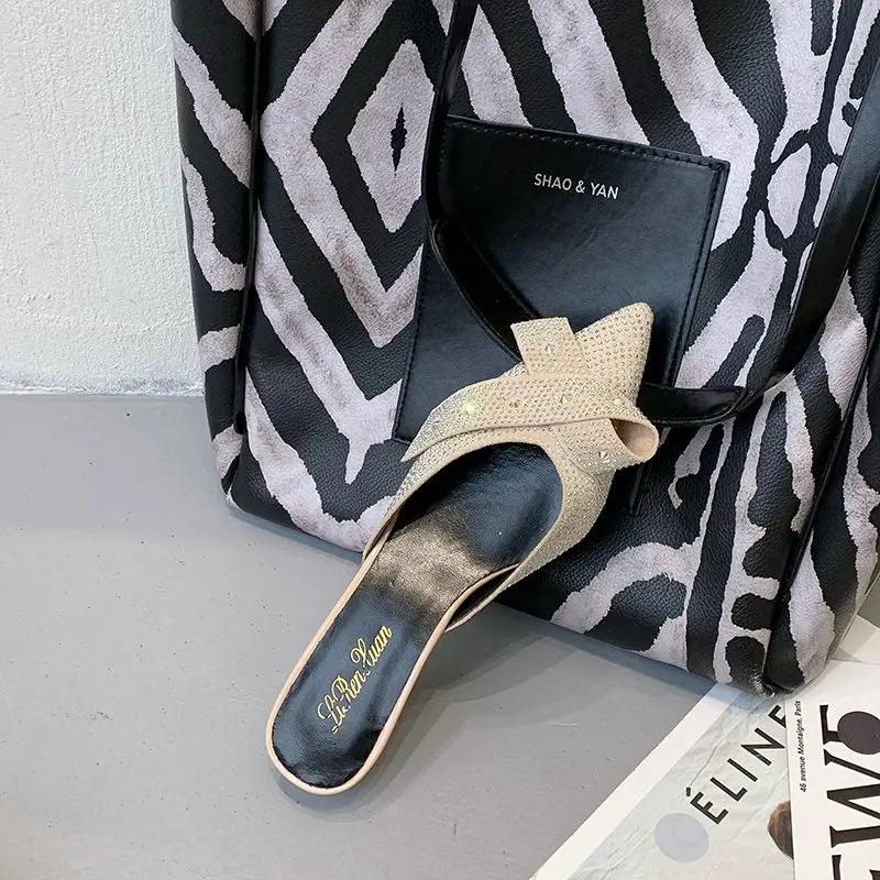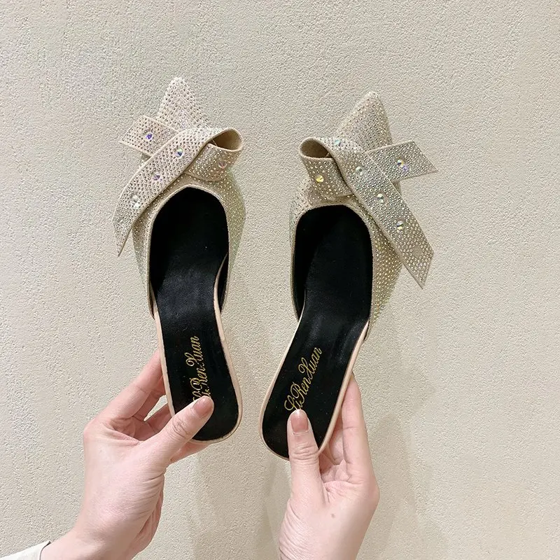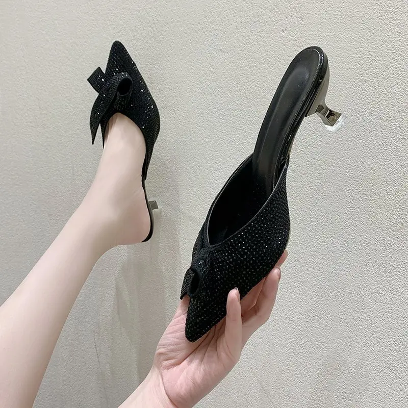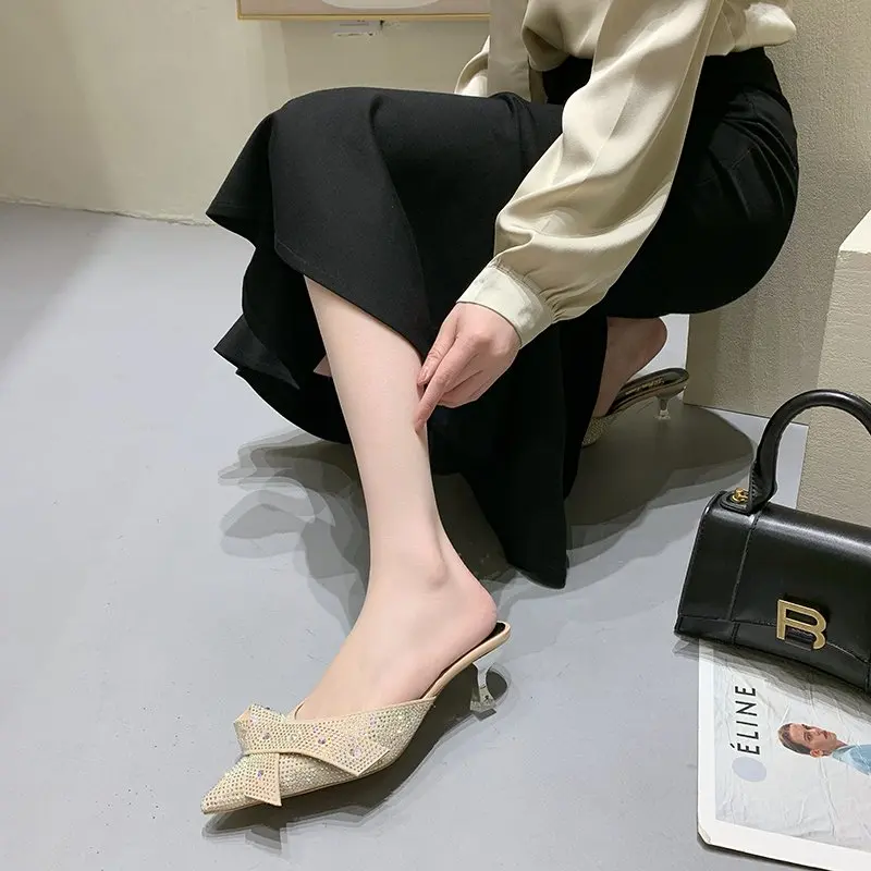 Полуботинки с острым носком шлёпанцы для женщин женская летняя одежда 2021 Новая мода стразы бант обувь без застежек, на высоких каблуках; Женская обувь BC558