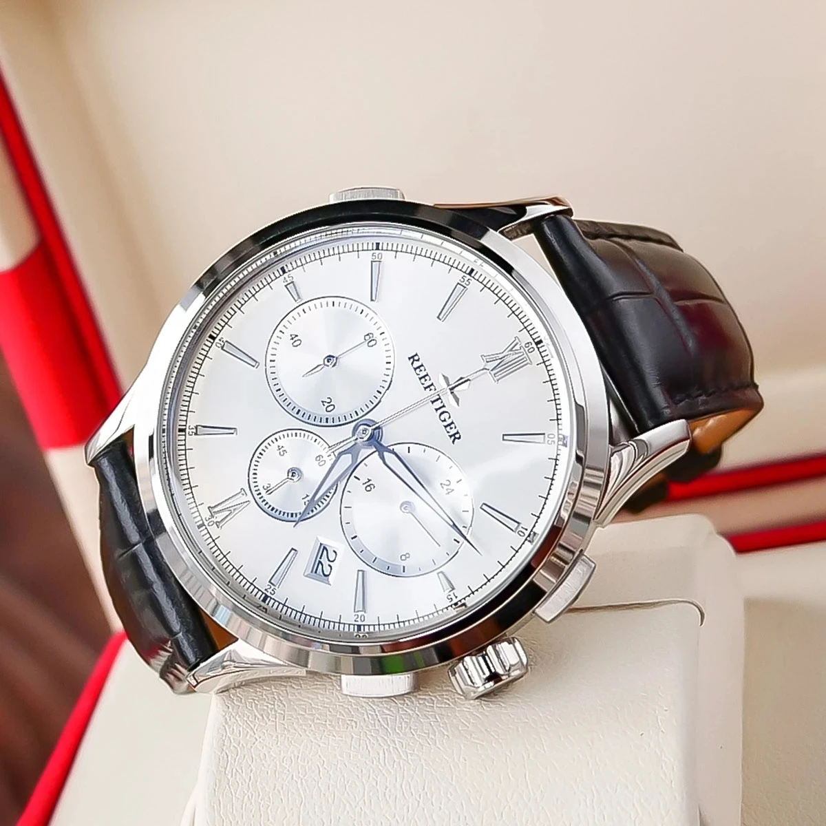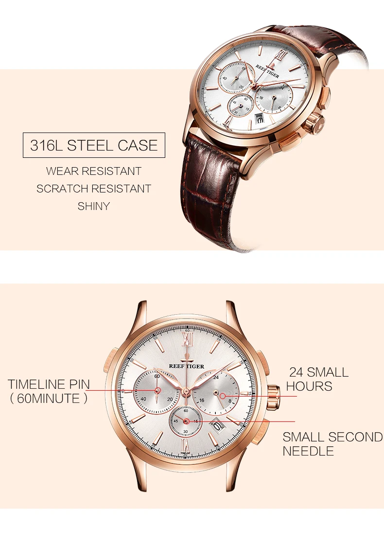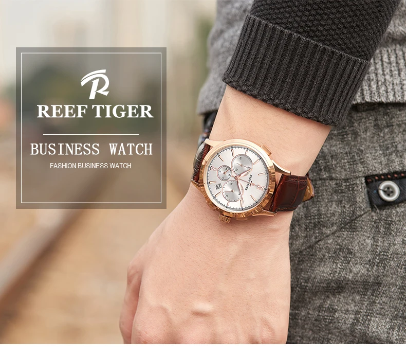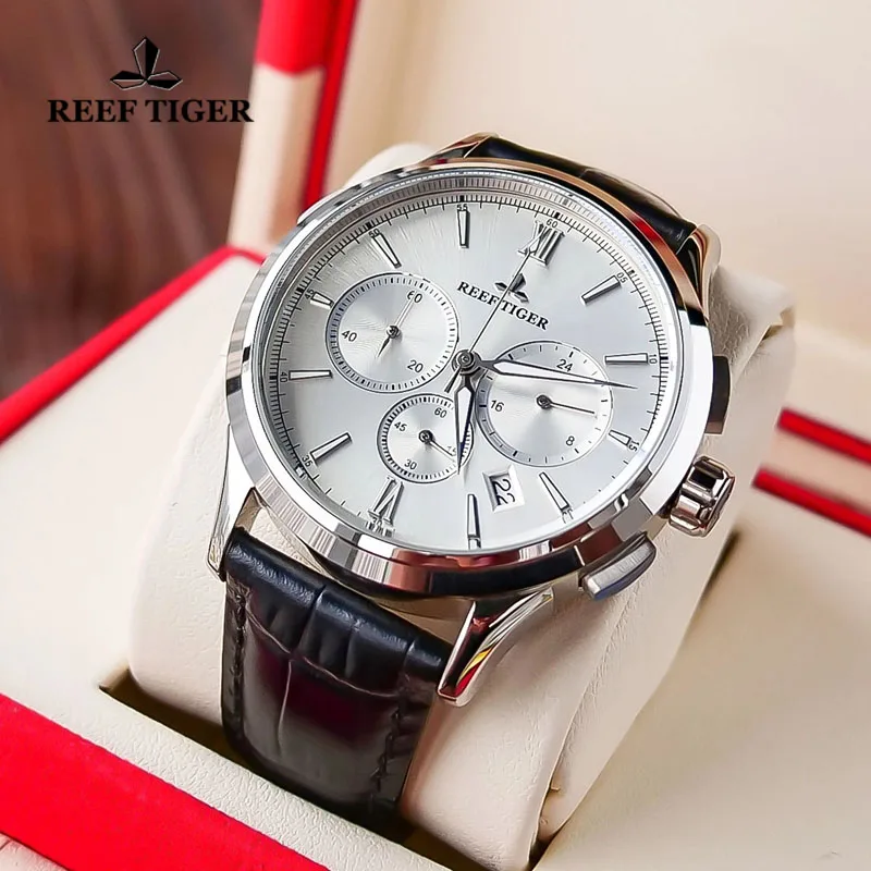 Мужские кварцевые часы Reef TigerRT 2021, с хронографом, с кожаным ремешком, с белым циферблатом, со светящейся датой, стальные часы