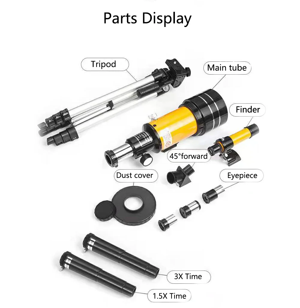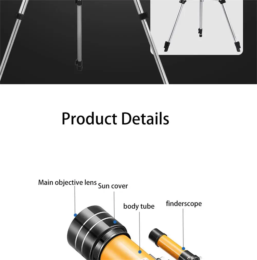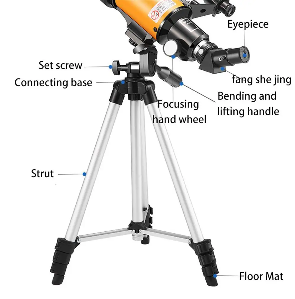 Увеличение: 150xДиаметр объектива: 70 ммОкуляры: 20 мм, 6 ммЛинза Барлоу: 3xМатериал штатива: алюминиевый сплавПервые три штатива телескопа не выдвигаются
