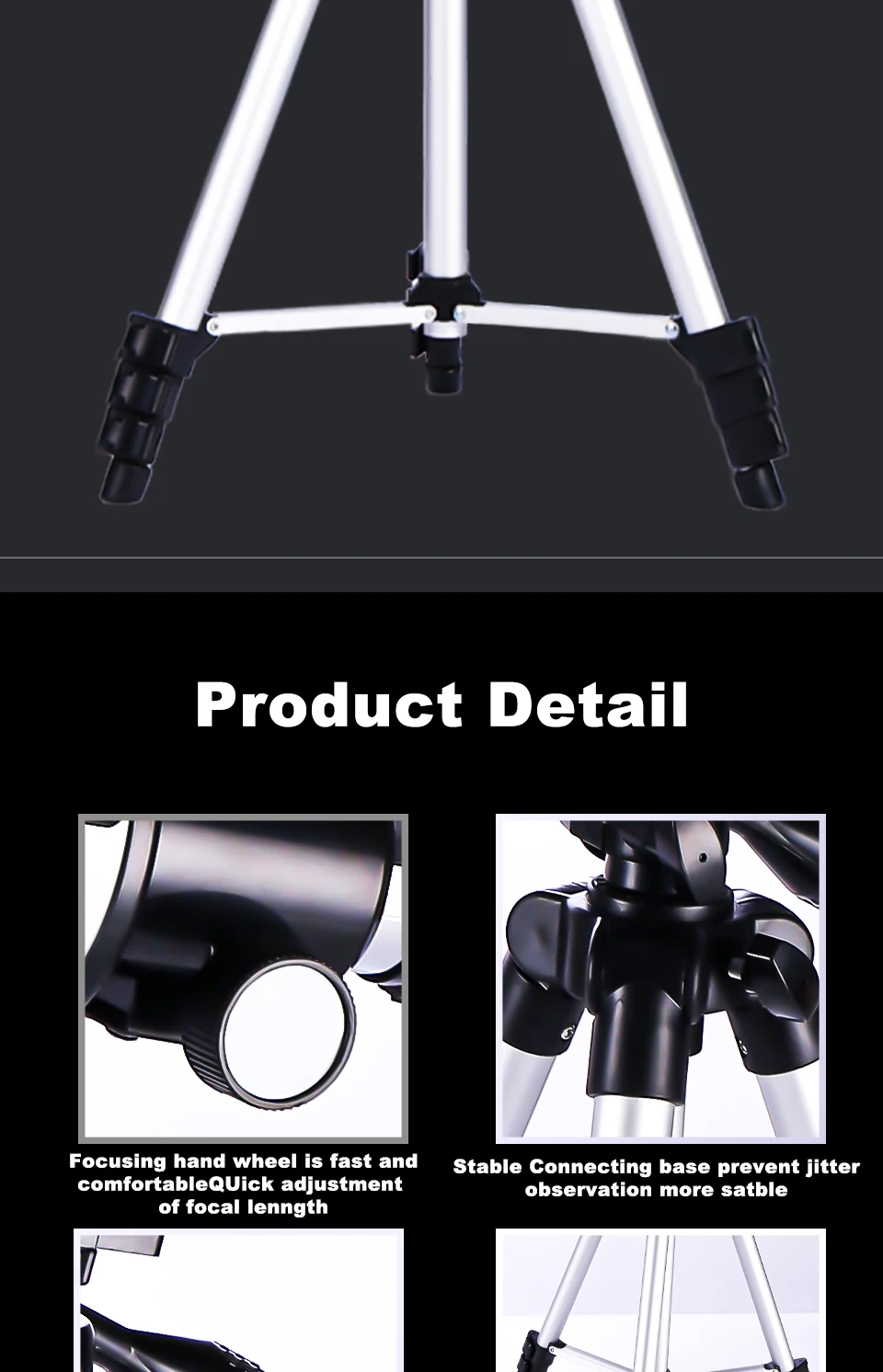 1. Более четкое видение2. Три окуляра: H6 мм, f12 мм, h20 мм3. Два телеуправления: 1.5X,3X4. Выдвижной Штатив: подходит для различных сцен (последние два телескопа являются обновлениями)