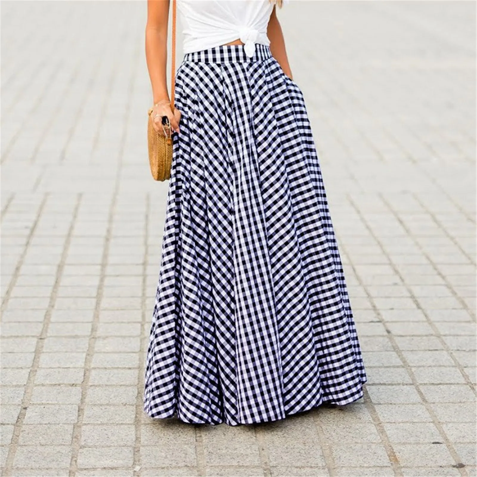 Женская длинная юбка с высокой талией, летняя винтажная клетчатая ю...