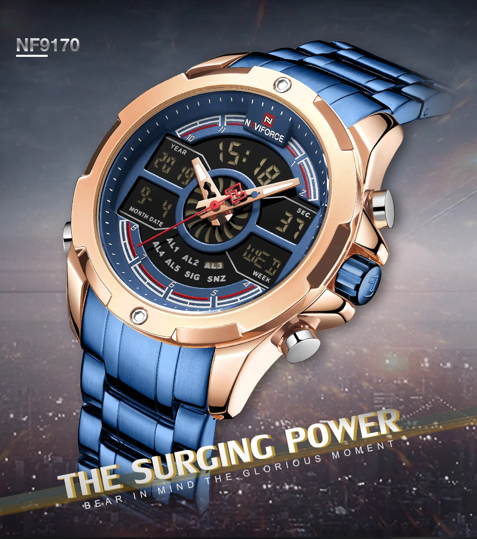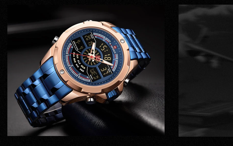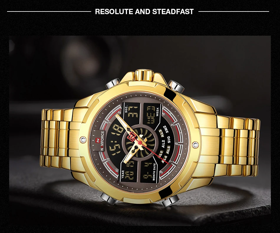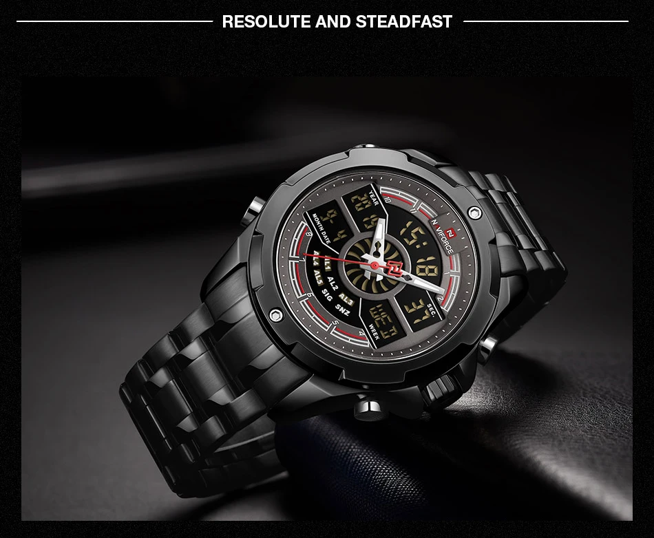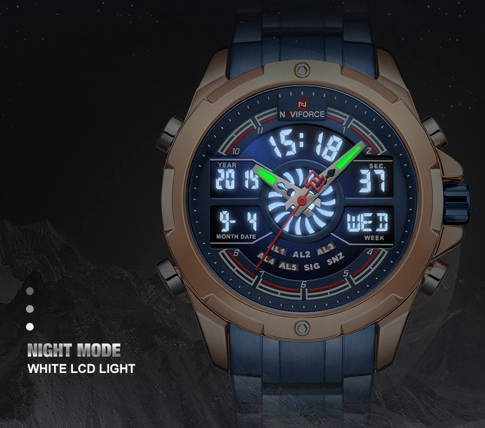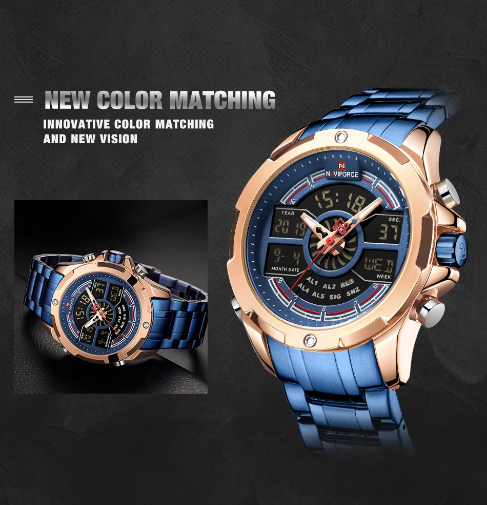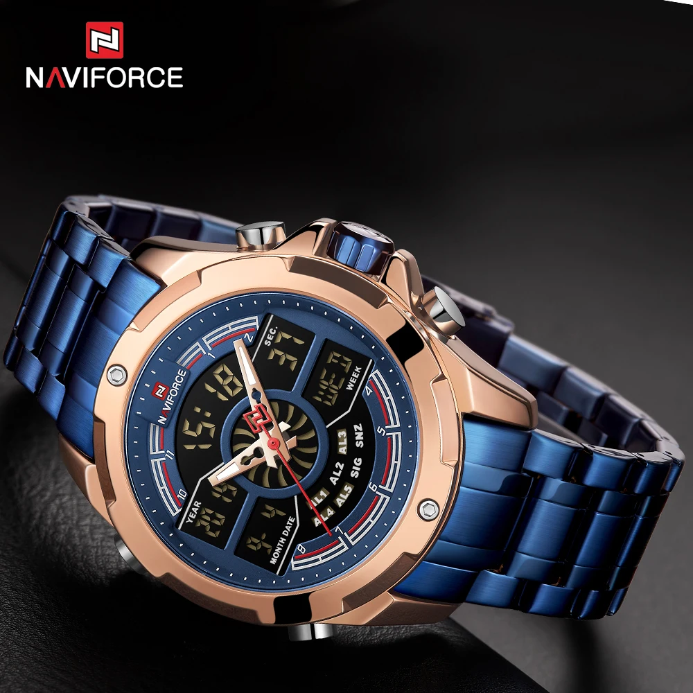NAVIFORCE Relogio бренд с большим циферблатом, двойной дисплей, кварцевые наручные часы, повседневные часы из нержавеющей стали, мужские цифровые часы с будильником, светящиеся часы