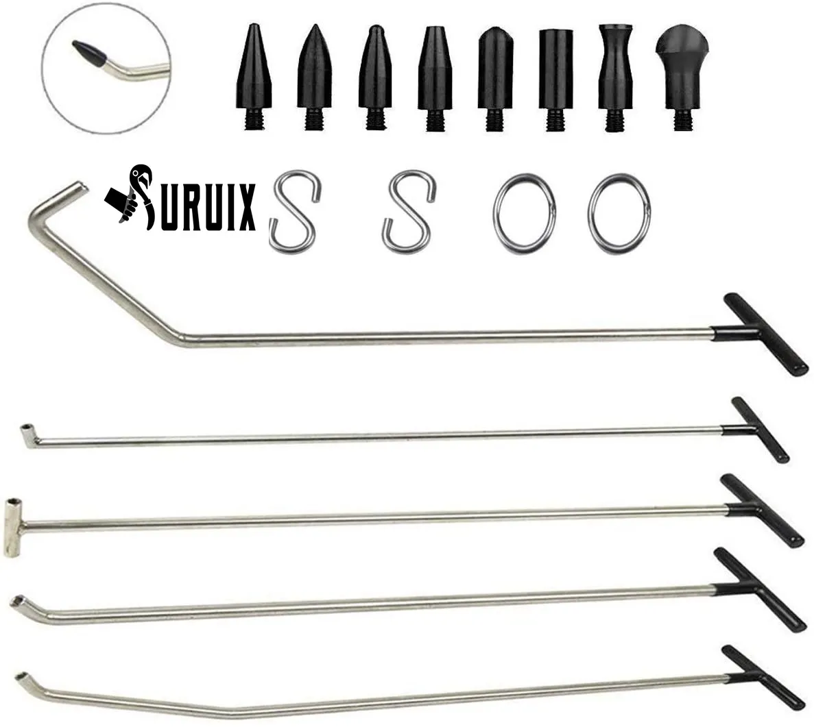 【 Набор стержней 5 шт. В комплекте 5 инструментальных стержней разного размера, каждый из которых имеет разную амплитуду, И может быть идеально Отремонтирован в соответствии с вмятинами или изгибами на разном кузове, чтобы помочь вам легко удалить вмятины и стать самым эффективным помощником. [Съемная коническая головка] 8 коническая головка съемная, резиновый и пластиковый материал, совместимы со стержнями, различной формы головки для разных вмятин и не повреждают оригинальную краску. Крючки в стиле S & O оснащены S-образным крючком и O-образным крючком, с принципом рычага для удаления раздражающих вмятин, просты в эксплуатации. [Нержавеющая сталь] стержни из нержавеющей стали, более толстые и жесткие, чем другие стержни, нелегко сгибать, особенно подходит для большой вмятины, а часть ручки изготовлена из резины, удобная ручка для долгой службы. [Широко используемые] стержни инструментов для удаления вмятин используются для ремонта автомобильных вмятин, повреждений от града, двери, мотоцикла и других металлических пластин, эффективно для ремонта больших вмятин.