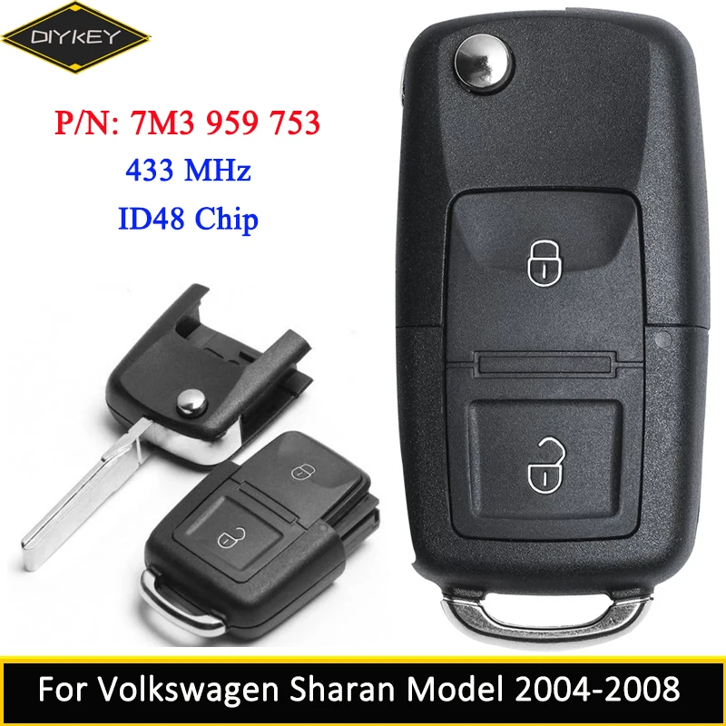 Пульт дистанционного управления DIYKEY 7M3, 959, 753, 433 МГц, 2 кнопки, для VW Sharan, модель 2004-2008, 7M3959753 ID48, чип HU66