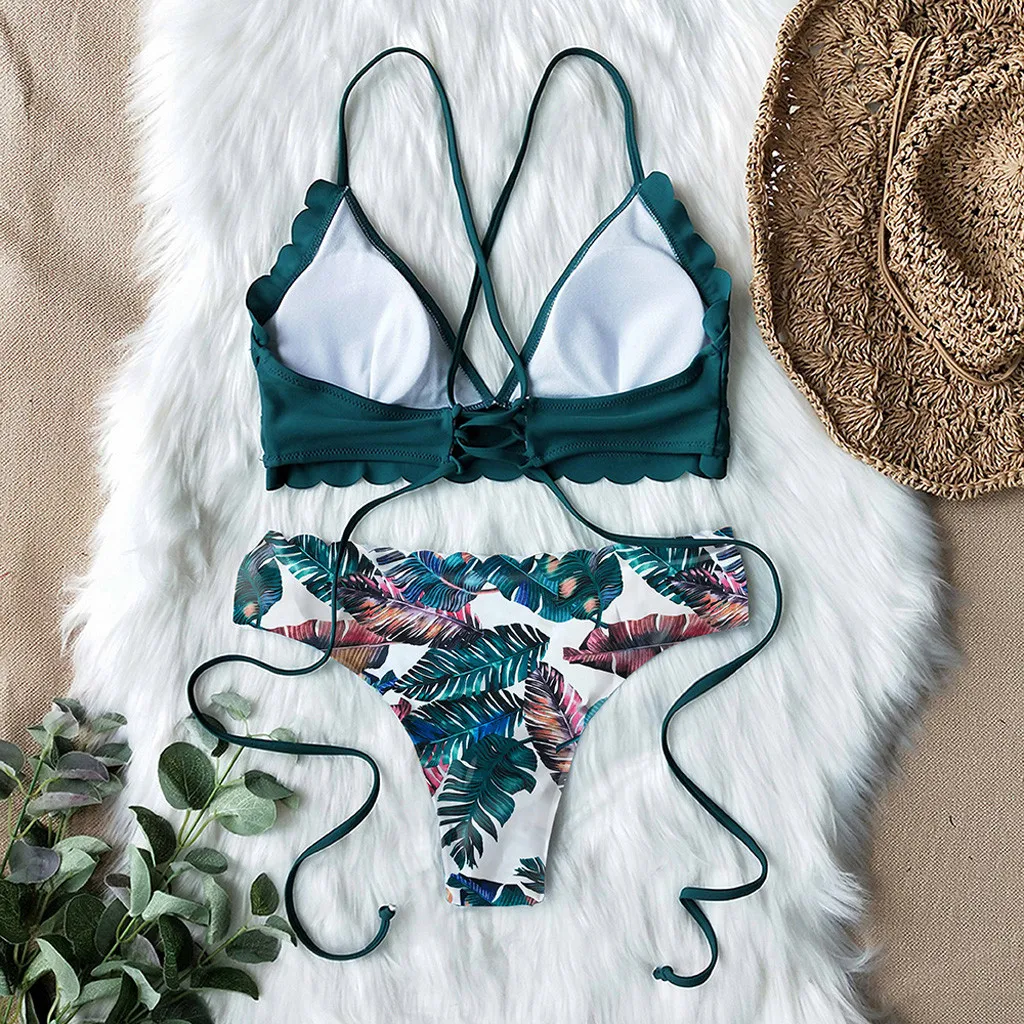 Женское бикини с фестончатым подолом и тропическим принтом, бикини с высоким вырезом, Раздельный купальник, Женский цельный купальник, Женский комплект 2 шт.