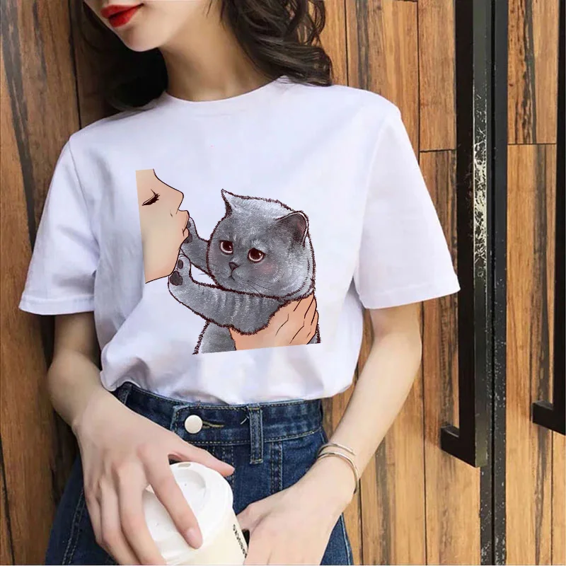 Женская футболка с коротким рукавом и круглым вырезом, с изображением милого кота отказывается от футболка поцелуй, в стиле Харадзюку