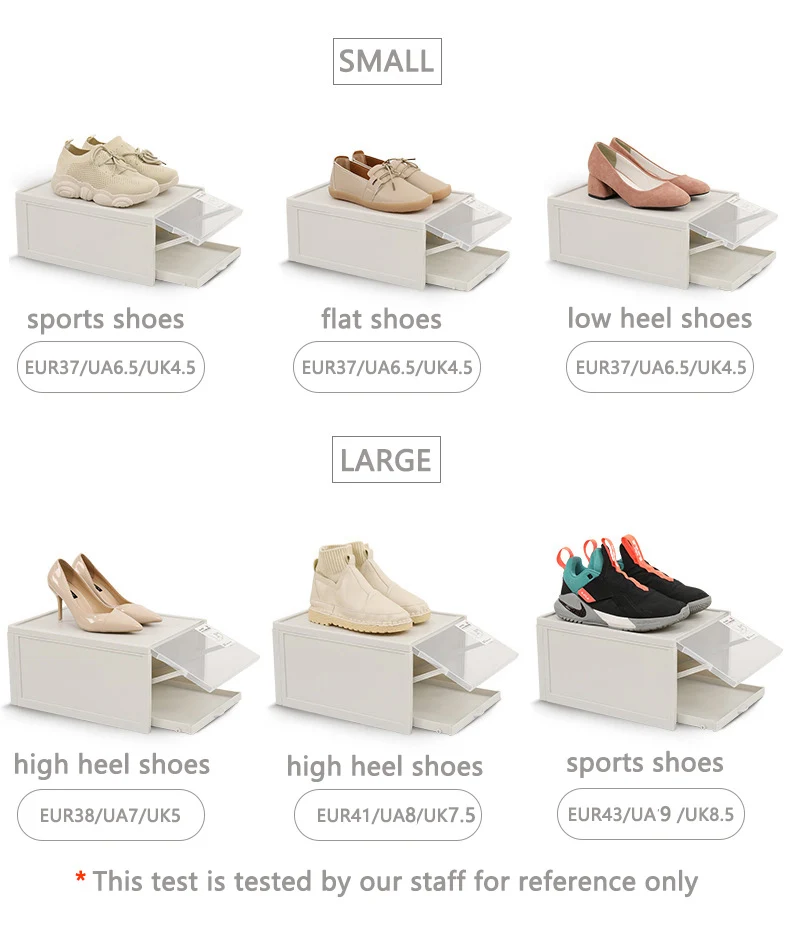 1. Товар: 3 шт. нажимные полки для обуви2. Функция: органайзер для хранения обуви3. Материал: пластик4. Особенности: нажимной органайзер для обуви, простой в установке, экономит место в обувной коробке5. Цвет: серый6. Внешний размер обувной коробки:Большой: 33,5*25,8*18,3 смМаленький: 33,5*23,5*14,1 см7. Внутренний размер обувной коробки:Большой: 31,9*21,8*16,5 смМаленький: 32*19,7*11,1 см