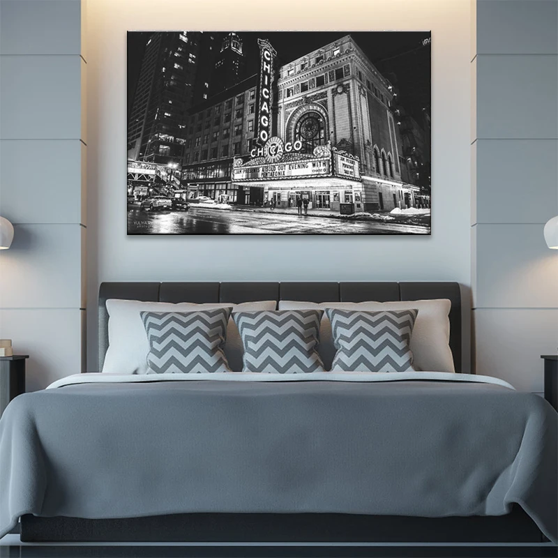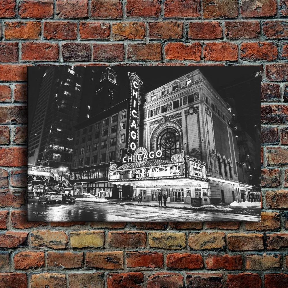 Офисная настенная художественная рамка, 1 шт., холст, живопись, черно-белые городские ретро-изображения, печать, комната, кинотеатр Чикаго, плакат, домашний декор