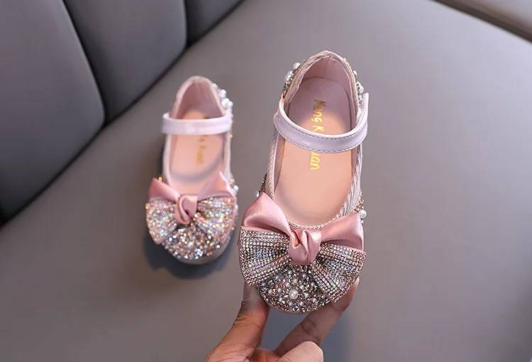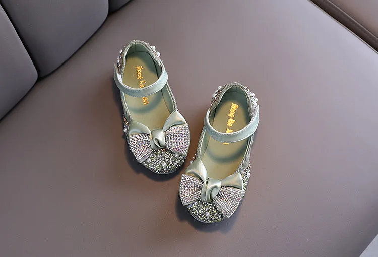 Туфли детские кожаные с бантом и стразами, обувь принцессы для танцев и вечеринок, плоская подошва для студентов, обувь для выступлений