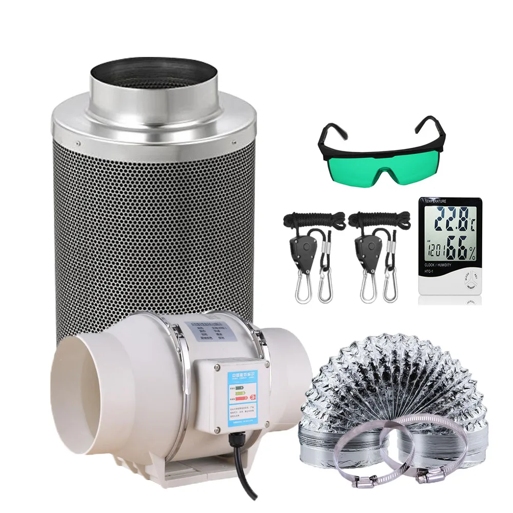 Название продукта: внутренний тент с активированным углем фильтр вентиляционный наборРазмер: 4/5/6 дюймаВ комплект входит: вентилятор * 1 фильтр * 1; Алюминиевая трубка 3 м * 1; Сухое горло * 2 крючка * 2; Защитные очки * 1; Термометр и гигрометр * 1Функция: Улучшение внутренней среды и стимулирование роста растений