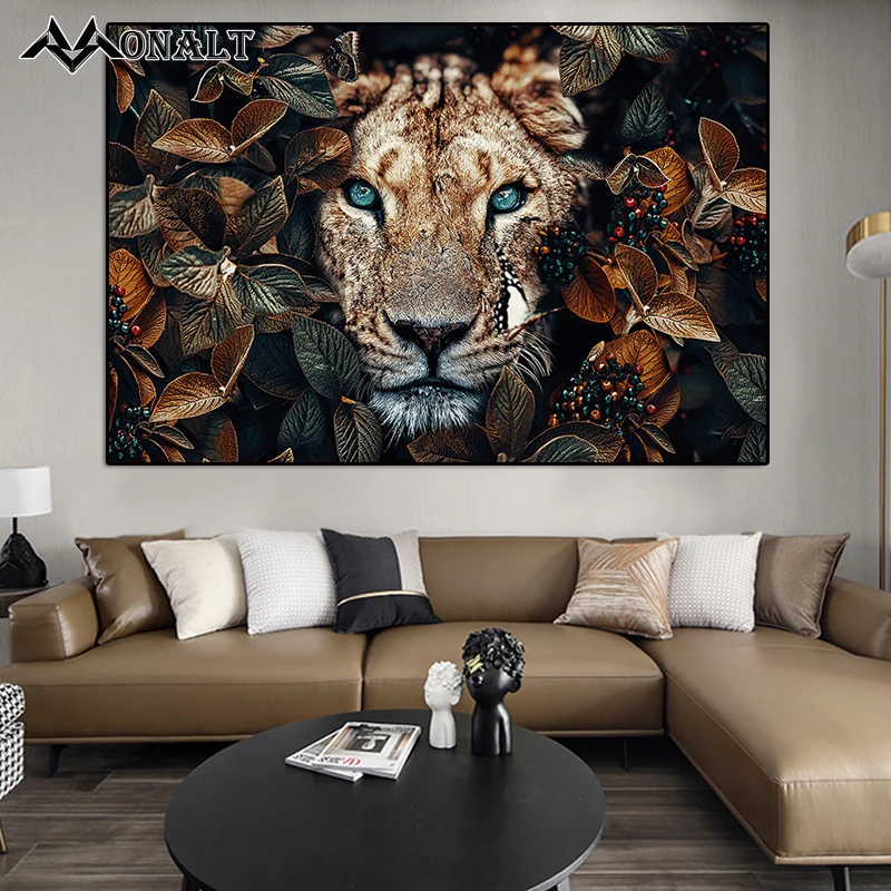 Постер на холсте с изображением Льва, коричневых листьев, цветов, животных