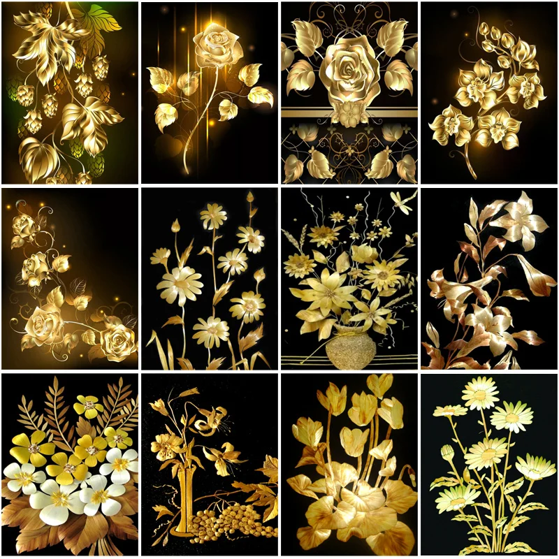 Алмазная живопись, вышивка, Золотой лист, цветок, Полный алмаз, сделай сам, 5D Вышивка крестиком, картина стразы, искусство, декоративная живопись