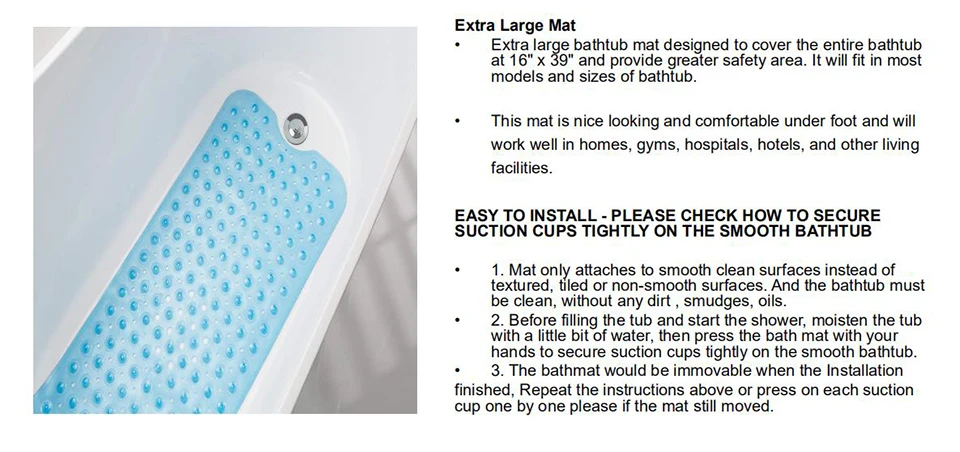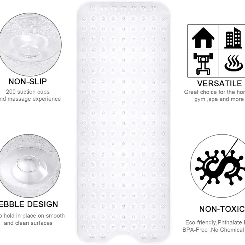 Удлиненный нескользящий коврик для ванной, Противоскользящий коврик для ванной, мягкий массажный коврик для ванной, присоска, сильный всасывающий коврик для душа, ковер 40*100 см Особенности:Этот коврик для ванной обеспечивает безопасное и удобное место для купания для детей, пожилых людей и других семей.Специальный дизайн с бисером для массажа, дарит ощущение комфорта.Присоска на дне, более прочно, не легко двигаться.Изготовлен из высококачественного материала, экологически чистый, нетоксичный и инородный, Ультра мягкий и приятный для кожи.Легко моется, машинная стирка, долговечность в течение длительного времени. Спецификация:Материал: ПВХРазмер изделия: 100*40 см/39,37*15,75 дюймаПосылка:1 * коврик для ванной