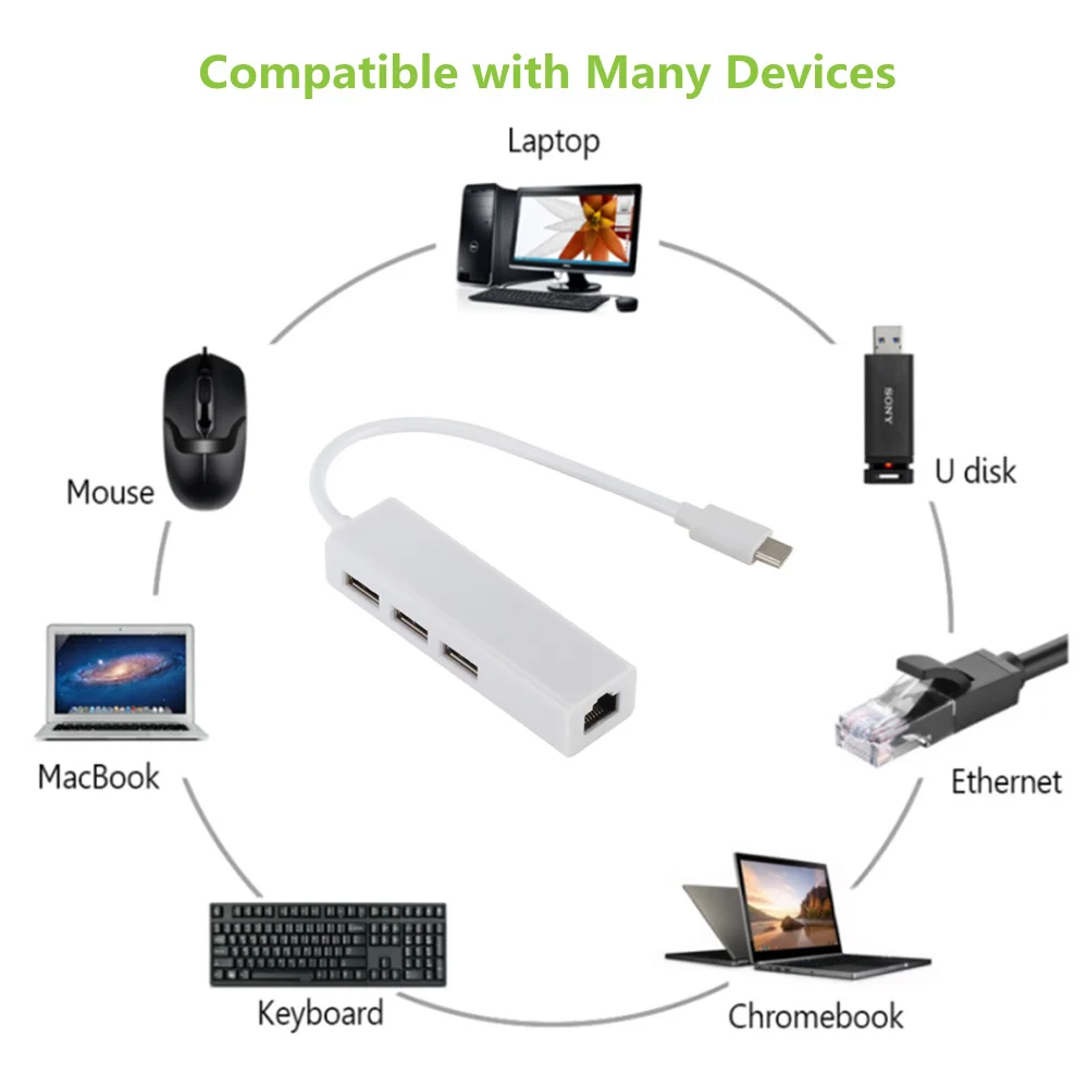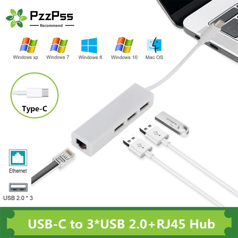 USB Ethernet PzzPss с 3 портами, usb-хаб 2,0 RJ45, сетевая карта Lan, USB C, адаптер Ethernet для Mac, iOS, Android, ПК, концентратор USB 2,0