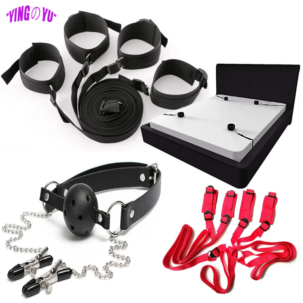 Наручники для БДСМ-фиксаторов для кровати, наручники, Манжеты Для лодыжек, кляп для рта, шарики, цепочка, зажимы для сосков, бондаж, интимные игрушки для орального секса для пар, игры для взрослых