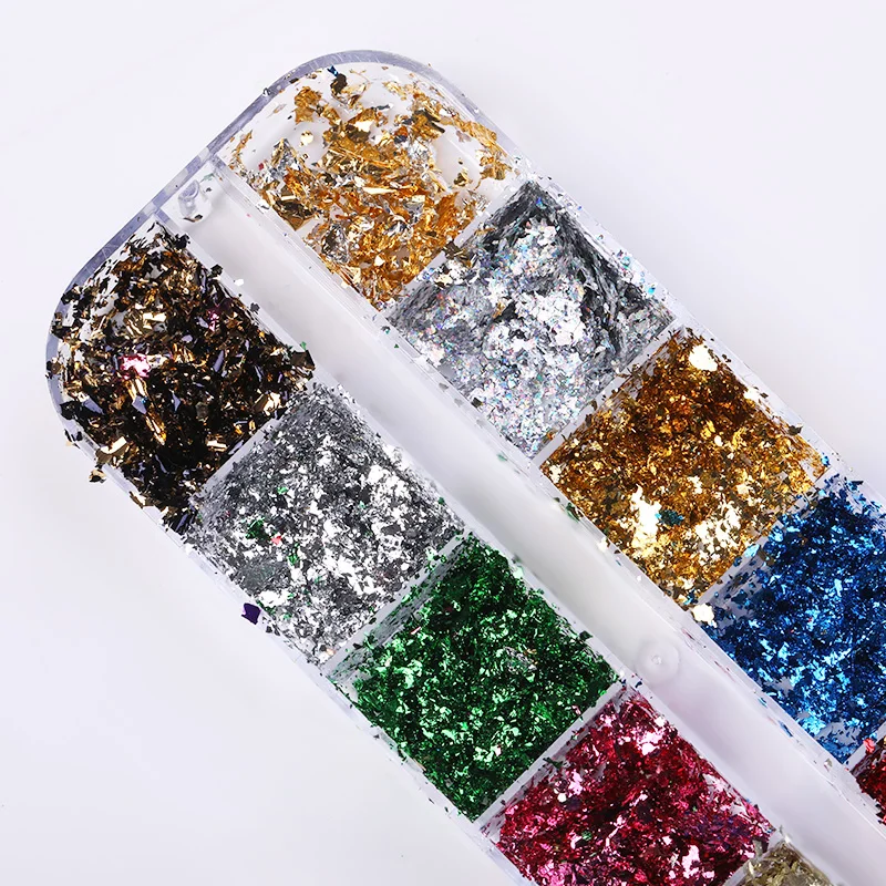 Золотая фольга, блестки для ногтей, 12 цветов, металлический порошок для ногтей, алюминиевые хлопья, блестки, серебряная фольга для ногтей, 3D украшения для ногтей своими руками
