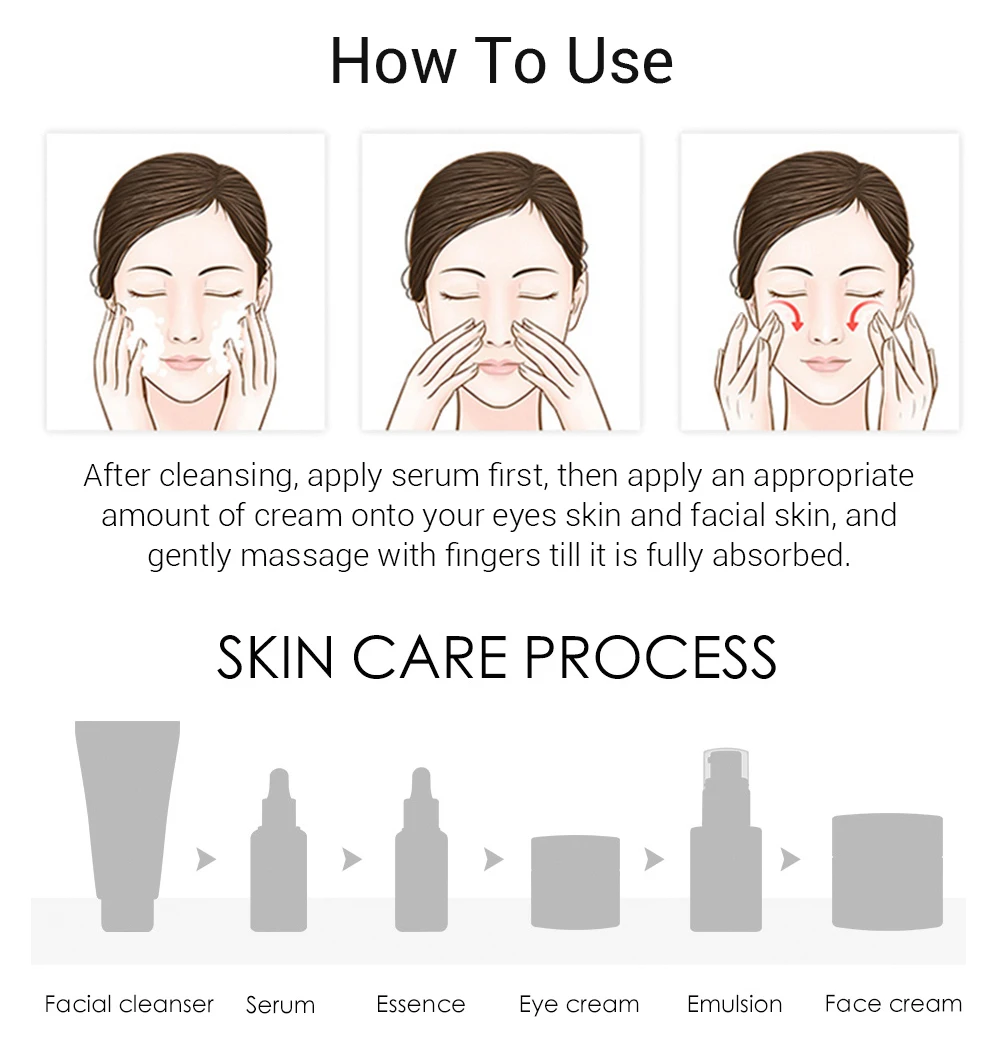 После очищения Сначала нанесите сыворотку, затем нанесите соответствующее количество крема на кожу глаз и кожу лица и аккуратно массируйте пальцами до полного впитывания.